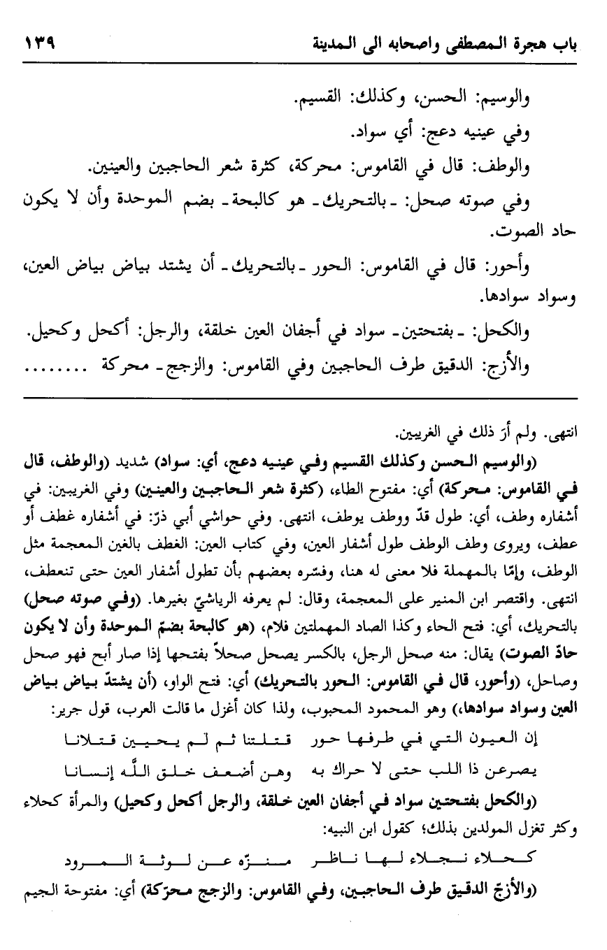"والوسيم الحسن وكذلك القسيم وفي عينيه دعج، أي: سواد" شديد "والوطف، قال في القاموس: محركة" أي: مفتوح الطاء، "كثرة شعر الحاجبين والعينين" وفي الغربيين: في أشفاره وطف، أي: طول قد ووطف يوطف، انتهى. وفي حواشي أبي ذر: في أشفاره غطف أو عطف، ويروى وطف الوطف طول أشفار العين، وفي كتاب العين: الغطف بالغين المعجمة مثل الوطف، وإما بالمهملة فلا معنى له هنا، وفسره بعضهم بأن تطول أشفار العين حتى تنعطف، انتهى. واقتصر ابن المنير على المعجمة، وقال: لم يعرفه الرياشي بغيرها. "وفي صوته صحل" بالتحريك، أي: فتح الحاء وكذا الصاد المهملتين فلام، "هو كالبحة بضم الموحدة وأن لا يكون حاد الصوت" يقال: منه صحل الرجل، بالكسر يصحل صحلا بفتحها إذا صار أبح فهو صحل وصاحل، "وأحور، قال في القاموس: الحور بالتحريك" أي: فتح الواو، "أن يشتد بياض بياض العين وسواد سوادها"، وهو المحمود المحبوب، ولذا كان أغزل ما قالت العرب، قول جرير: