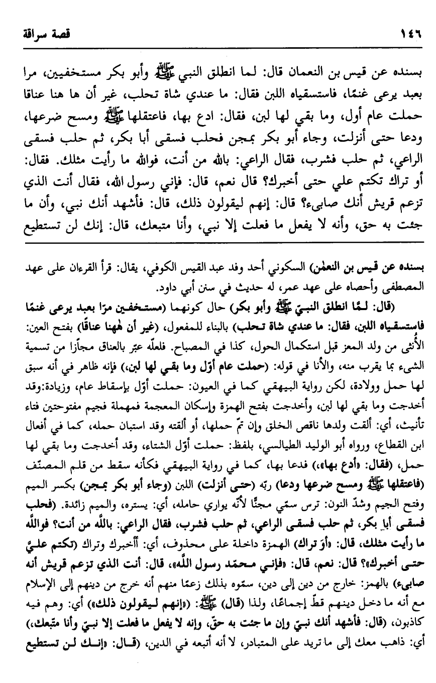بسنده عن قيس بن النعمان قال: لما انطلق النبي -صلى الله عليه وسلم- وأبو بكر مستخفيين، مرا بعبد يرعى غنما، فاستسقياه اللبن فقال: ما عندي شاة تحلب، غير أن ههنا عناقا حملت عام أول، وما بقي لها لبن، فقال: "ادع بها"، فاعتقلها -صلى الله عليه وسلم- ومسح ضرعها، ودعا حتى أنزلت، وجاء أبو بكر بمجن فحلب فسقى أبا بكر، ثم حلب فسقى الراعي، ثم حلب فشرب، فقال الراعي: بالله من أنت، فوالله ما رأيت مثلك. فقال: "أوتراك تكتم عليَّ حتى أخبرك"؟ قال: نعم، قال: "فإني رسول الله"، فقال: أنت الذي تزعم قريش أنك صابئ؟ قال: "إنهم ليقولون ذلك" قال: فأشهد أنك نبي، وأن ما جئت به حق، وأنه لا يفعل ما فعلت إلا نبي، وأنا متبعك، قال: "إنك لن تستطيع