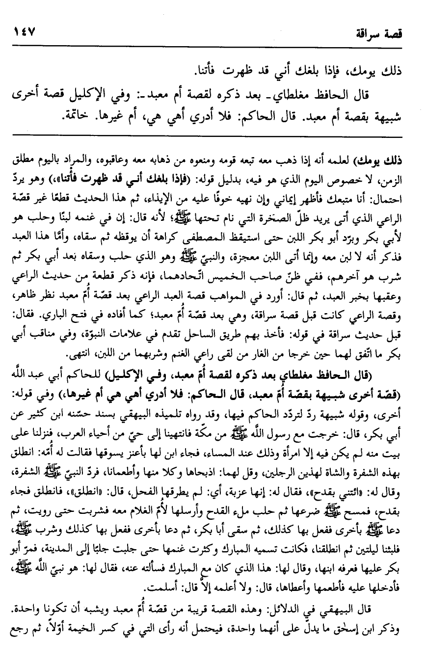 قال الحافظ مغلطاي -بعد ذكره لقصة أم معبد: وفي الإكليل قصة أخرى شبيهة بقصة أم معبد. قال الحاكم: فلا أدري أهي هي، أم غيرها. خاتمة.