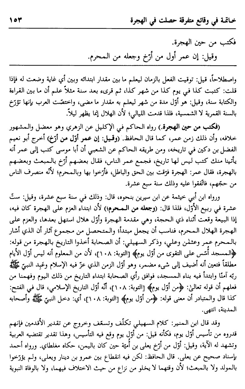 "فكتب من حين الهجرة" رواه الحاكم في الإكليل عن الزهري وهو معضل والمشهور خلافه، وأن ذلك زمن عمر، كما قال الحافظ. "وقيل: إن عمر أول من أرخ" أخرج أبو نعيم الفضل بن دكين في تاريخه، ومن طريقه الحاكم عن الشعبي أن أبا موسى كتب إلى عمر أنه يأتينا منك كتب ليس لها تاريخ، فجمع عمر الناس، فقال بعضهم أرخ بالمبعث وبعضهم بالهجرة، فقال عمر: الهجرة فرقت بين الحق والباطل، فأرخوا بها وبالمحرم؛ لأنه منصرف الناس من حجهم، فاتفقوا عليه وذلك سنة سبع عشرة.