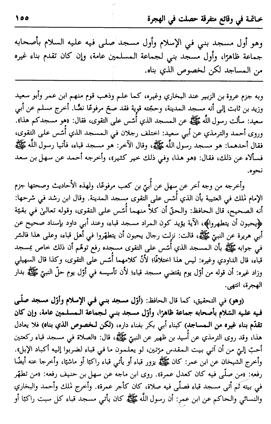 وهو أول مسجد بني في الإسلام وأول مسجد صلى فيه عليه السلام بأصحابه جماعة ظاهرا، وأول مسجد بني لجماعة المسلمين عامة، وإن كان تقدم بناء غيره من المساجد لكن لخصوص الذي بناه.