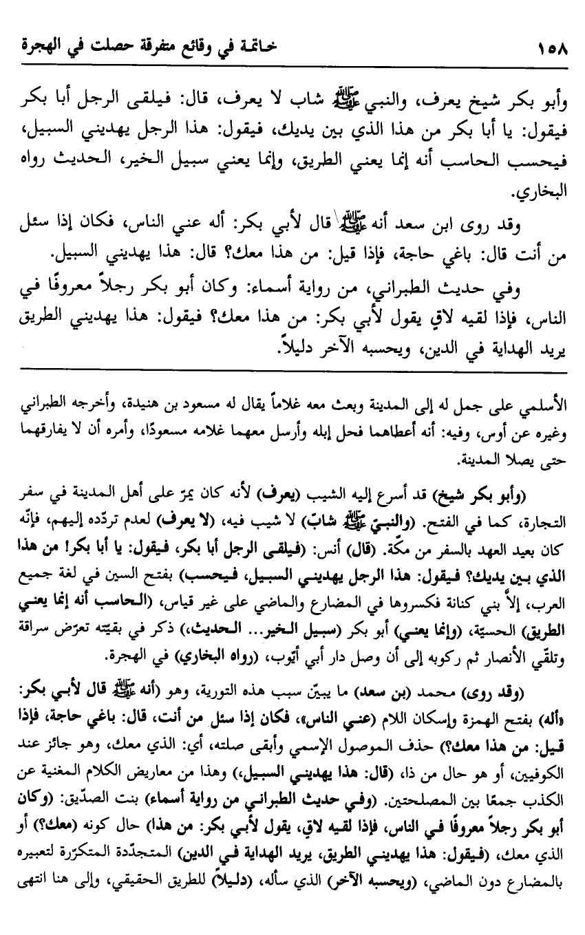 وأبو بكر شيخ يعرف، والنبي صلى الله عليه وسلم شاب لا يعرف، قال: فيلقى الرجل أبا بكر فيقول: يا أبا بكر من هذا الذي بين يديك، فيقول: هذا الرجل يهديني السبيل، فيحسب الحاسب أنه إنما يعني الطريق، وإنما يعني سبيل الخير، الحديث رواه البخاري.