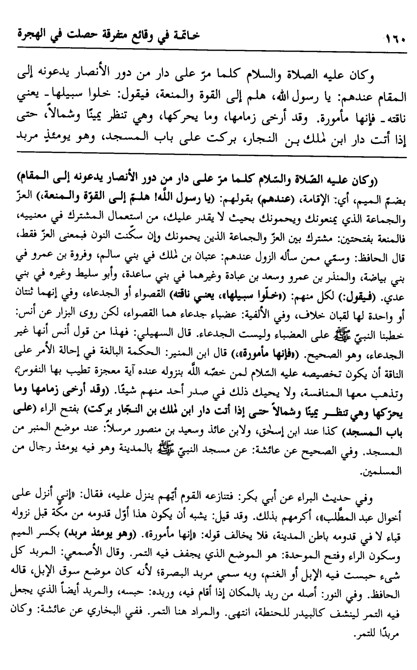 "وكان عليه الصلاة والسلام كلما مر على دار من دور الأنصار يدعونه إلى المقام" بضم الميم، أي: الإقامة، "عندهم" بقولهم: "يا رسول الله! هلم إلى القوة والمنعة" العز والجماعة الذي يمنعونك ويحمونك بحيث لا يقدر عليك، من استعمال المشترك في معنييه، فالمنعة بفتحتين: مشترك بين العز والجماعة الذين يحمونك وإن سكنت النون فبمعنى العز فقط، قال الحافظ: وسمي ممن سأله الزول عندهم: عنبان بن مالك في بني سالم، وفروة بن عمرو في بني بياضة، والمنذر بن عمرو وسعد بن عبادة وغيرهما في بني ساعدة، وأبو سليط وغيره في بني عدي. "فيقول:" لكل منهم: "خلو سبيلها"، يعني ناقته" القصواء أو الجدعاء، وفي إنهما ثنتان أو واحدة لها لقبان خلاف، وفي الألفية: عضباء جدعاء هما القصواء، لكن روى البزار عن أنس: خطبنا النبي صلى الله عليه وسلم على العضباء وليست الجدعاء. قال السهيلي: فهذا من قول أنس أنها غير الجدعاء، وهو الصحيح، "فإنها مأمورة" قال ابن المنير: الحكمة البالغة في إحالة الأمر على الناقة أن يكون تخصيصه عليه السلام لمن خصه الله بنزوله عند آية معجزة تطيب بها النفوس، وتذهب معها المنافسة، ولا يحيك ذلك في صدر أحد منهم شيئا. "وقد أرخى زمامها وما يحركها وهي تنظر يمينا وشمالا حتى إذا أتت دار ابن مالك بن النجار بركت" بفتح الراء "على باب المسجد" كذا عند ابن إسحاق، ولابن عائذ وسعيد بن منصور مرسلا: عند موضع المنبر من المسجد. وفي الصحيح عن عائشة: عن مسجد النبي صلى الله عليه وسلم بالمدينة وهو فيه يومئذ رجال من المسلمين.