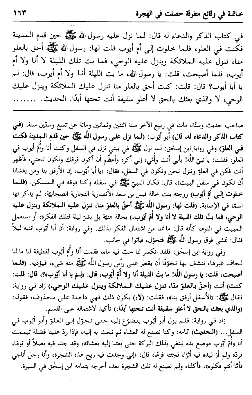 صاحب حديث وسنة، مات في ربيع الآخر سنة وثمانين ومائة عن تسع وستين سنة. "في كتاب الذكر والدعاء له، قال" أبو أيوب: "لما نزل على رسول الله صلى الله عليه وسلم حين قدم المدينة فكنت في العلو" وفي رواية ابن إسحاق: لما نزل صلى الله عليه وسلم في بيتي نزل في السفل وكنت أنا وأم أيوب في العلو، فقلت: يا نبي الله! بأبي أنت وأمي، إني أكره وأعظم أن أكون فوقك وتكون تحتي، فأظهر أنت فكن في العلو وننزل نحن ونكون في السفل، فقال: "يا أبا أيوب، إن الأرفق بنا ومن يغشانا أن نكون في سفل البيت"، قال: فكان النبي صلى الله عليه وسلم في سفله وكنا فوقه في المسكن. "فلما خلوت إلى أم يوب" زوجته بنت خالة قيس بن سعد الأنصارية النجارية الصحابية، لم يذكر لها اسما في الإصابة. "قلت لها: رسول الله صلى الله عليه وسلم أحق بالعلو منا، تنزل عليه الملائكة وينزل عليه الوحي، فما بت تلك الليلة لا أنا ولا أم أيوب" بحالة هنية بل بشر ليلة لتلك الفكرة، أو استعمل المبيت في النوم، كأنه قال: ما نمنا من اشتغال الفكر بذلك. وفي رواية: أن أبا بكر أيوب انتبه ليلا فقال: نمشي فوق رسول الله صلى الله عليه وسلم فتحول، فباتوا في جانب.