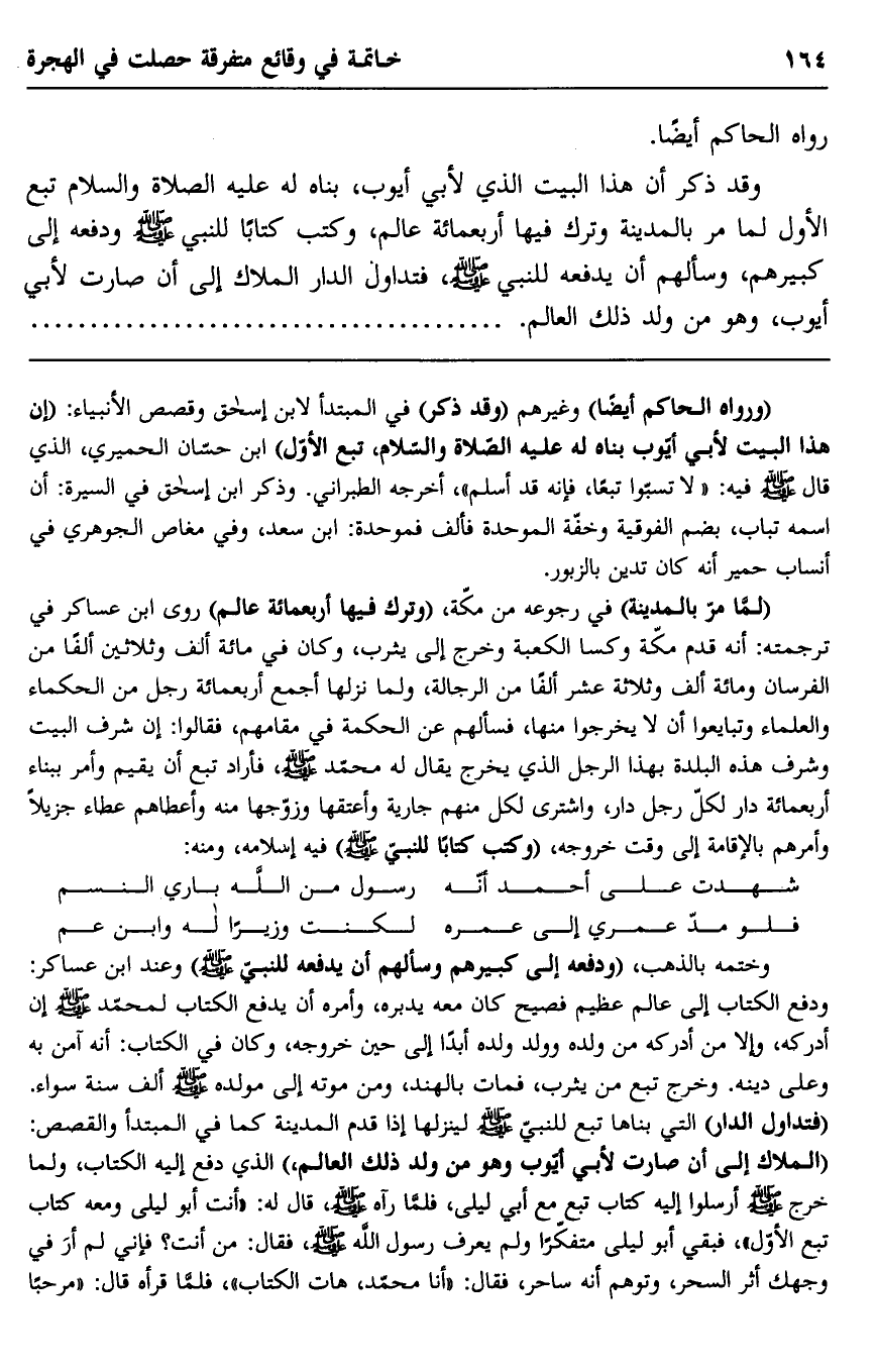 وقد ذكر أن هذا البيت الذي لأبي أيوب، بناه له عليه الصلاة والسلام تبع الأول لما مر بالمدينة وترك فيها أربعمائة عالم، وكتب كتابا للنبي صلى الله عليه وسلم ودفعه إلى كبيرهم، وسألهم أن يدفعه للنبي صلى الله عليه وسلم فتداول الدار الملاك إلى أن صارت لأبي أيوب، وهو من ولد ذلك العالم..........................................................