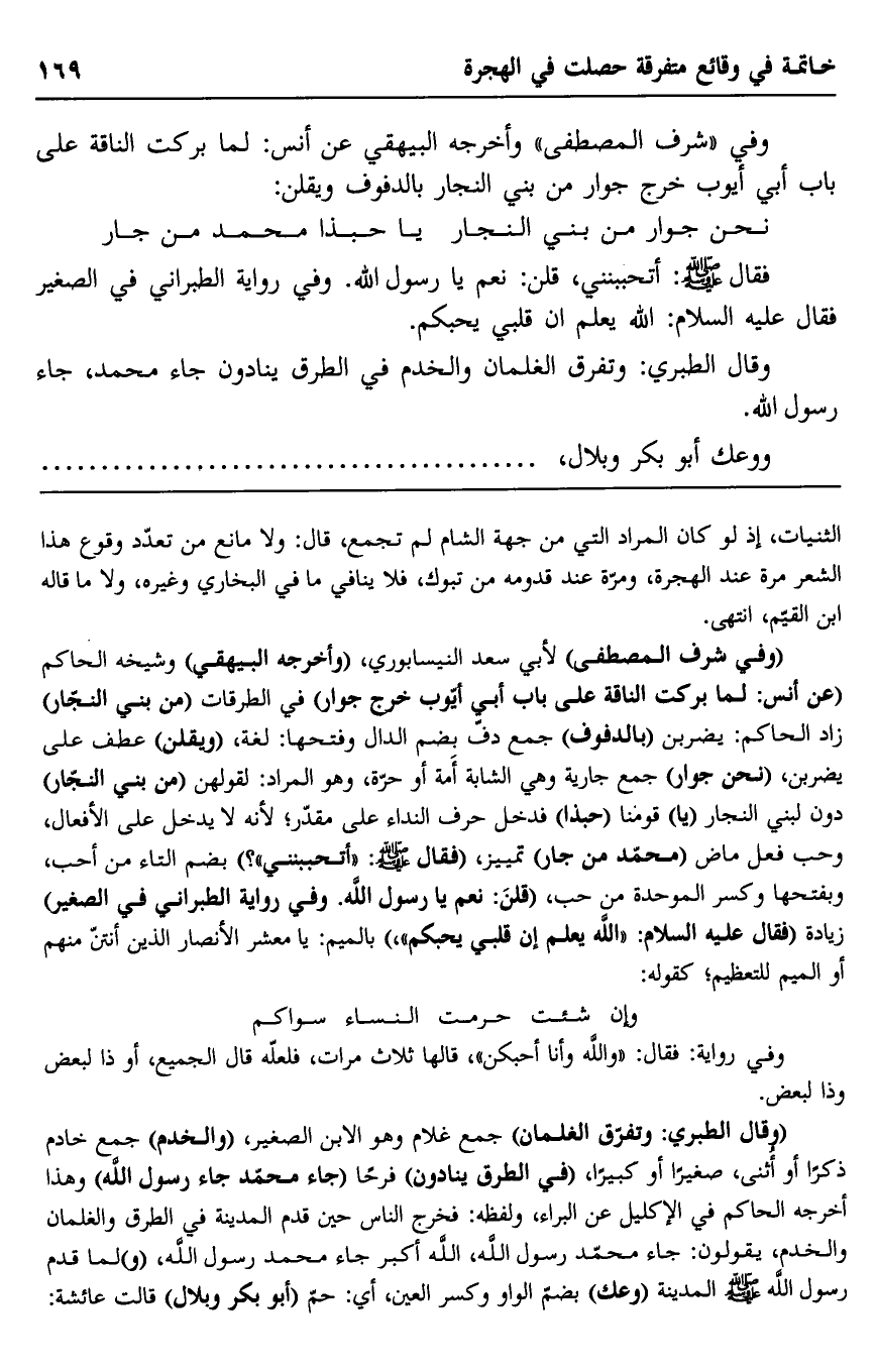 "وفي شرف المصطفى" لأبي سعد النيسابوري، "وأخرج البيهقي" وشيخه الحاكم "عن أنس: لما بركت الناقة على باب أبي أيوب خرج جوار" في الطرقات "من بني النجار" زاد الحاكم: يضربن "بالدفوف" جمع دف بضم الدال وفتحها. لغة، "ويقلن" عطف على يضربن، "نحن جوار" جمع جارية وهي الشابة أمة أو حرة، وهو المراد: لقولهن "من بني النجار" دون لبني النجار "يا" قومنا "حبذا" فدخل حرف النداء على مقدر؛ لأنه لا يدخل على الأفعال، وحب فعل ماض "محمد بن جار" تمييز، "فقال صلى الله عليه وسلم: "أتحبنني"؟ بضم التاء من أحب، وبفتحها وكسر الموحدة من حب، "قلن: نعم يا رسول الله. وفي رواية الطبراني في الصغير" زيادة "فقال عليه السلام: "الله يعلم إن قلبي يحبكم"، بالميم: يا معشر الأنصار أنتن منهم أو الميم للتعظيم، كقوله: