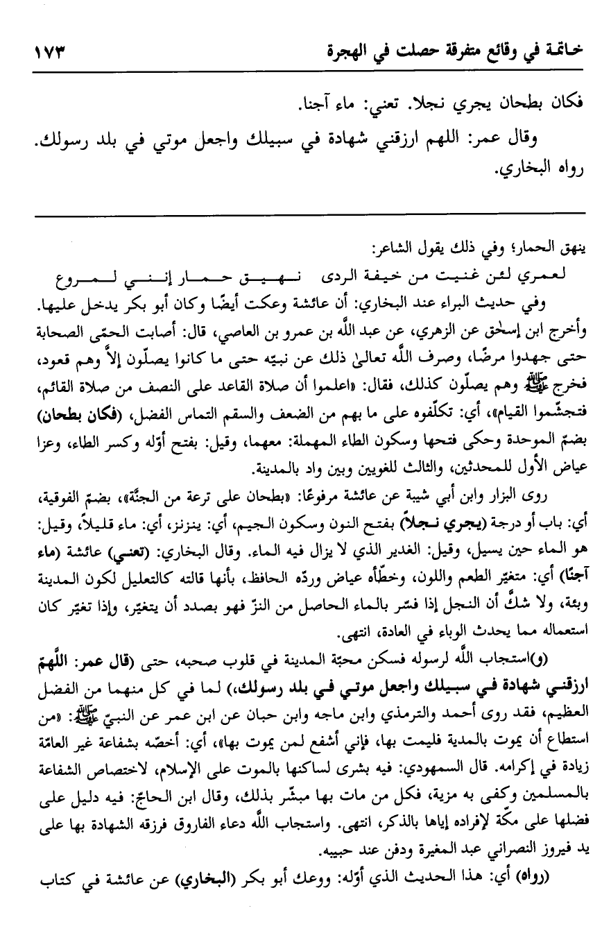 "و" استجاب الله لرسوله فسكن محبة المدينة في قلوب صحبه، حتى "قال عمر: اللهم ارزقني شهادة في سبيلك واجعل موتي في بلد رسولك" لما في كل منهما من الفضل العظيم، فقد روى أحمد والترمذي وابن ماجه وابن حبان عن ابن عمر عن النبي صلى الله عليه وسلم: "من استطاع أن يموت بالمدينة فليمت بها، فإني أشفع لمن يموت بها"، أي: أخصه بشفاعة غير العامة زيادة في إكرامه. قال السمهودي: فيه بشرى لساكنها بالموت على الإسلام، لاختصاص الشفاعة بالمسلمين وكفى به مزية، فكل من مات بها مبشر بذلك، وقال ابن الحاج: فيه دليل على فضلها على مكة لإفراده إياها بالذكر، انتهى. واستجاب الله دعاء الفاروق فرزقه الشهادة بها على يد فيروز النصراني عبد المغيرة ودفن عند حبيبه.