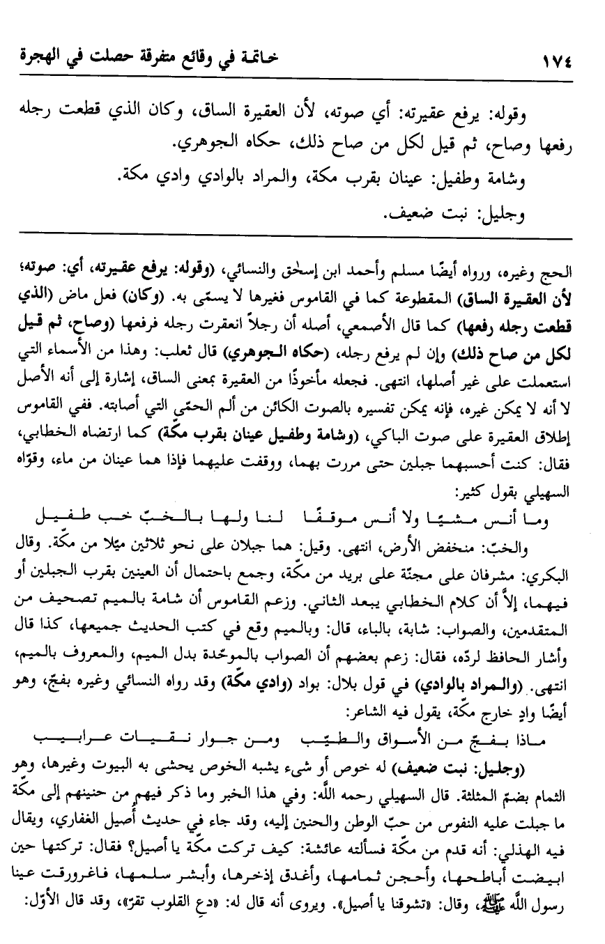 الحج وغيره، ورواه أيضا مسلم وأحمد وابن إسحاق والنسائي، "وقوله: يرفع عقيرته، أي: صوته؛ لأن العقيرة السابق" المقطوعة كما في القاموس فغيرها لا يسمى به. "وكان" فعل ماض "الذي قطعت رجله فرفعها" كما قال الأصمعي، أصله أن رجلا انعقرت رجله فرفعها "وصاح، ثم قيل لكل من صاح ذلك" وإن لم يرفع رجله، "حكاه الجوهري" قال ثعلب: وهذا من الأسماء التي استعملت على غير أصلها، انتهى. فجعله مأخوذا من العقيرة بمعنى الساق، إشارة إلى أنه الأصل لا أنه لا يمكن غيره، فإنه يمكن تفسيره بالصوت الكائن من ألم الحمى التي أصابته. ففي القاموس إطلاق العقيرة على صوت الباكي، "وشامة وطفيل عينان بقرب مكة" كما ارتضاه الخطابي، فقال: كنت أحسبهما جبلين حتى مررت بهما، ووقفت عليهما فإذا هما عينان من ماء، وقواه السهيلي بقول كثير: