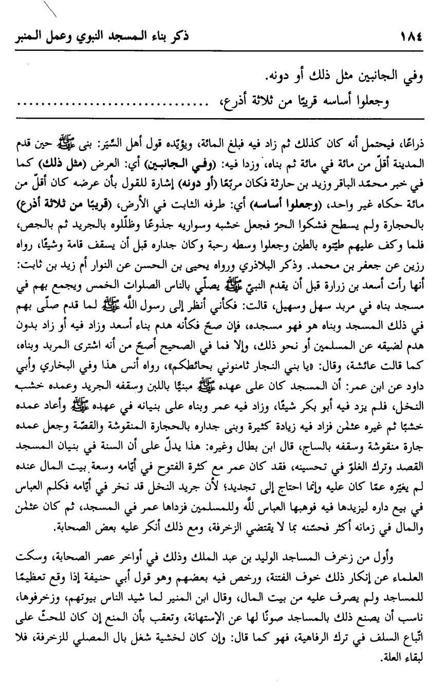 ذراعا، فيحتمل أنه كان كذلك ثم زاد فيه فبلغ المائة، ويؤيده قول أهل السير: بنى صلى الله عليه وسلم حين قدم المدينة أقل من مائة في مائة ثم بناه، وزدا فيه: "وفي الجانبين" أي: العرض "مثل ذلك" كما في خبر محمد الباقر وزيد بن حارثة فكان مربعا "أو دونه" إشارة للقول بأن عرضه كان أقل من مائة حكاه غير واحد، "وجعلوا أساسه" أي: طرفه الثابت عن الأرض، "قريبا من ثلاثة أذرع" بالحجارة ولم يسطح فشكوا الحر فجعل خشبه وسواريه جذوعا وظللوه بالجريد ثم بالجص، فلما وكف عليهم طينوه بالطين وجعلوا وسطه رحبة وكان جداره قبل أن يسقف قامة وشيئا، رواه رزين عن جعفر بن محمد. وذكر البلاذري ورواه يحيى بن الحسن عن النوار أم زيد بن ثابت: أنها رأت أسعد بن زرارة قبل أن يقدم النبي صلى الله عليه وسلم يصلي بالناس الصلوات الخمس ويجمع بهم في مسجد بناه في مربد سهل وسهيل، قالت: فكأني أنظر إلى رسول الله صلى الله عليه وسلم لما قدم صلى بهم في ذلك المسجد وبناه هو فهو مسجده، فإن صح فكأنه هدم بناء أسعد وزاد فيه أو زاد بدون هدم لضيقه عن المسلمين أو نحو ذلك، وإلا فما في الصحيح أصح من أنه اشترى المربد وبناه، كما قالت عائشة، وقال: "يا بني النجار ثامنوني بحائطكم"، رواه أنس هذا وفي البخاري, وأبي داود عن ابن عمر: أن المسجد كان على عهده صلى الله عليه وسلم مبنيا اللبن وسقفه الجريد وعمده خشب النخل، فلم يزد فيه أبو بكر شيئا، وزاد فيه عمر وبناه على بنيانه في عهده صلى الله عليه وسلم وأعاد عمده خشبا ثم غيره عثمان فزاد فيه زيادة كثيرة وبنى جداره بالحجارة المنقوشة والقصة وجعل عمده جارة منقوشة وسقفه بالساج، قال ابن بطال وغيره: هذا يدل على أن السنة في بنيان المسجد القصد وترك الغلو في تحسينه، فقد كان عمر مع كثرة الفتوح في أيامه وسعة بيت المال عنده لم يغيره عما كان عليه وإنما احتاج إلى تجديد؛ لأن جريد النخل قد نخر في أيامه فكلم العباس في بيع داره ليزيدها فيه فوهبها العباس لله وللمسلمين فزادها عمر في المسجد، ثم كان عثمان والمال في زمانه أكثر فحسنه بما لا يقتضي الزخرفة، ومع ذلك أنكر عليه بعض الصحابة.