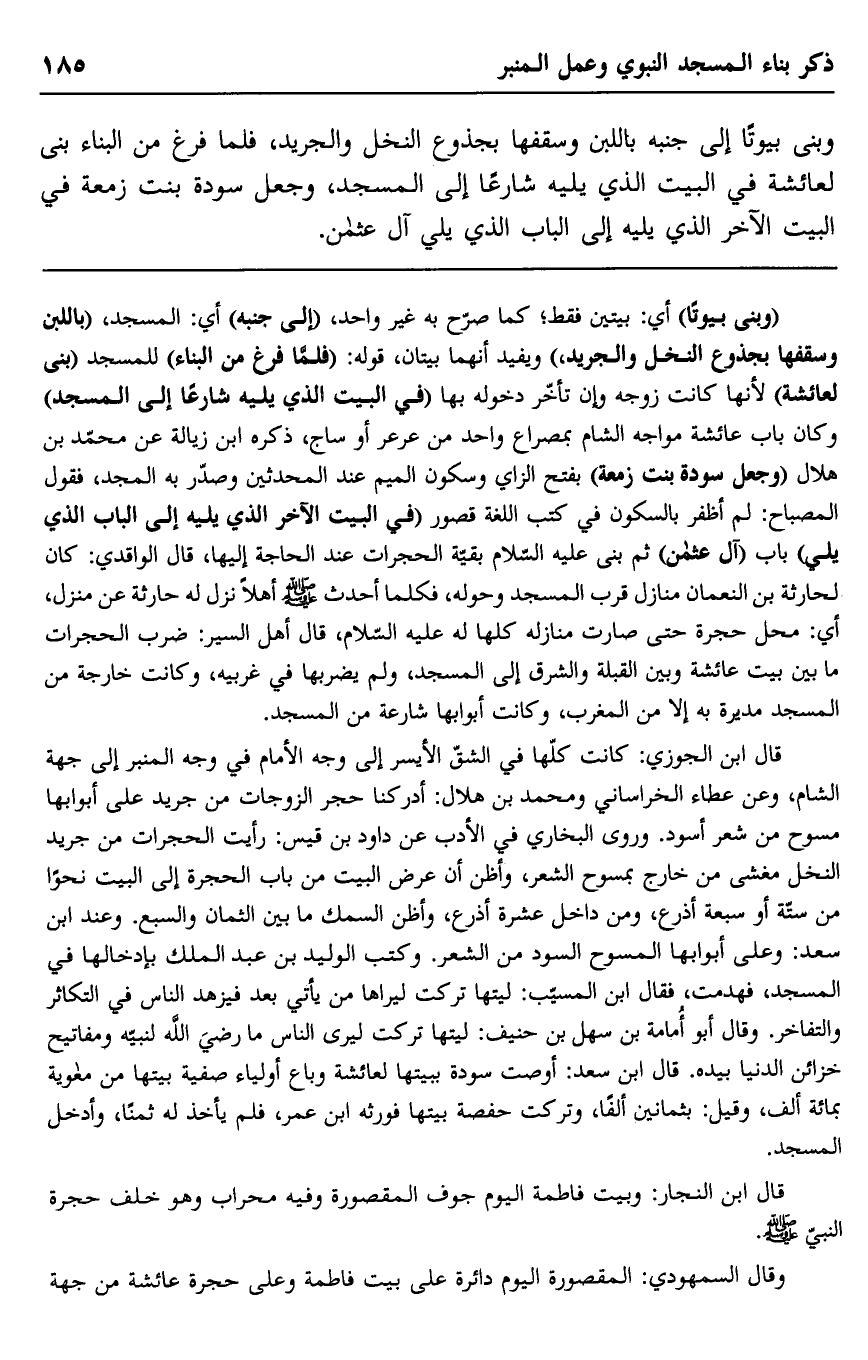 وبنى بيوتا إلى جنبه باللبن وسقفها بجذوع النخل والجريد، فلما فرغ من البناء بنى لعائشة في البيت الذي يليه شارعا إلى المسجد، وجعل سودة بن زمعة في البيت الآخر الذي يليه إلى الباب الذي يلي آل عثمان.