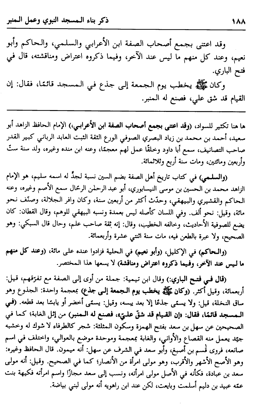 ههنا تكثير للسواد، "وقد اعتنى بجمع أصحاب الصفة ابن الأعرابي،" الإمام الحافظ الزاهد أبو سعيد، أحمد بن محمد بن زياد البصري الورع الثقة الثبت العابد الرباني كبير القدر صاحب التصانيف، سمع أبا داود وخلقا عمل لهم معجما، وعنه ابن منده وغيره، ولد سنة ست وأربعين ومائتين، ومات سنة أربع وثلاثمائة.