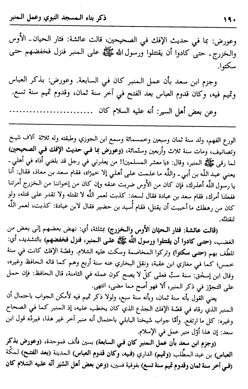 يعني القول بأنه سنة ثمان، وبأنه سنة سبع، ولولا ذكر تميم فيه لأمكن الجواب باحتمال أن المنبر الذي رقاه في قصة الإفك الجذع الذي كان يخطب عليه؛ ذ المنبر كما في الصحاح وغيره: كل ما ارتفع. وأما جواب شيخنا البابلي باحتمال أنه منبر آخر غير هذا، فيرده قول ابن سعد: إن هذا أول منبر عمل في الإسلام.