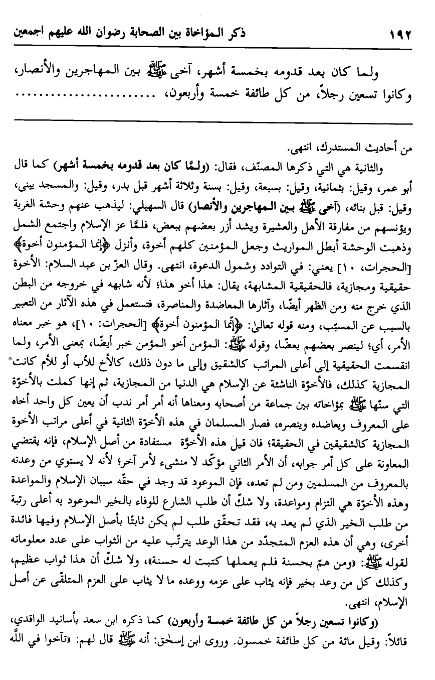 ولما كان بعد قدومه بخمسة أشهر، آخى صلى الله عليه وسلم بين المهاجرين والأنصار، وكانوا تسعين رجلا، من كل طائفة خمسة وأربعون،...................................