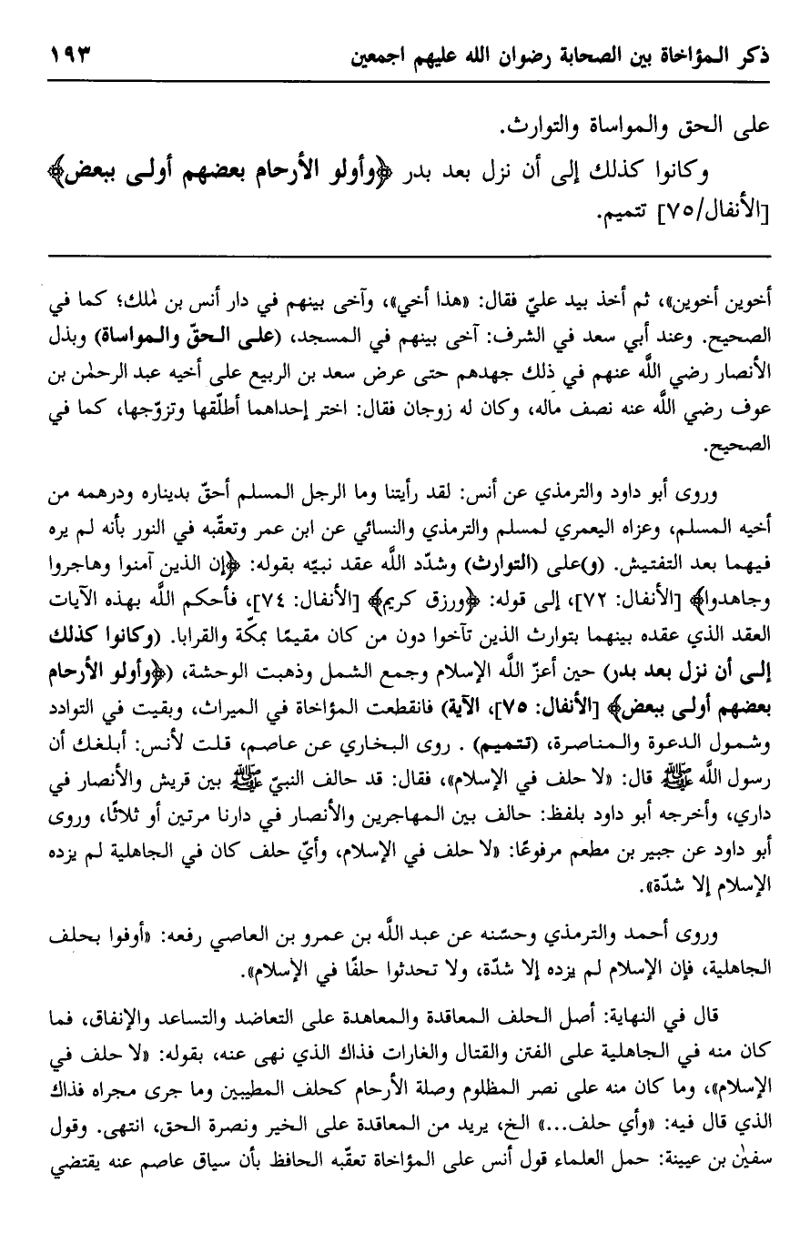 وروى أبو داود والترمذي عن أنس: لقد رأيتنا وما الرجل المسلم أحق بديناره ودرهمه من أخيه المسلم، وعزاه اليعمري لمسلم والترمذي والنسائي عن ابن عمر وتعقبه في النور بأنه لم يره فيهما بعد التفتيش. "و" على "التوارث" وشدد الله عقد نبيه بقوله: {إِنَّ الَّذِينَ آمَنُوا وَهَاجَرُوا وَجَاهَدُوا} [الأنفال: 72] ، إلى قوله: {وَرِزْقٌ كَرِيم} [الأنفال: 74] ، فاحكم الله بهذه الآيات العقد الذي عقده بينهما بتوارث الذين تآخوا دون من كان مقيما بمكة والقرابا. "وكانوا كذلك إلى أن نزل بعد بدر" حين أعز الله الإسلام وجمع الشمل وذهبت الوحشة، {وَأُولُو الْأَرْحَامِ بَعْضُهُمْ أَوْلَى بِبَعْضٍ} [الأنفال: 75] الآية" فانقطعت المؤاخاة في الميراث، وبقيت في التوادد وشمول الدعوة والمناصرة "تتميم". روى البخاري عن عاصم، قلت لأنس: أبلغك أن رسول الله صلى الله عليه وسلم قال: "لا حلف في الإسلام"، فقال: قد حالف النبي صلى الله عليه وسلم بين قريش والأنصار في داري، وأخرجه أبو داود بلفظ: حالف بين المهاجرين والأنصار في دارنا مرتين أو ثلاثا، وروى أبو داود عن جبير بن مطعم مرفوعا: "لا حلف في الإسلام، وأي حلف كان في الجاهلية لم يزده الإسلام إلا شدة".