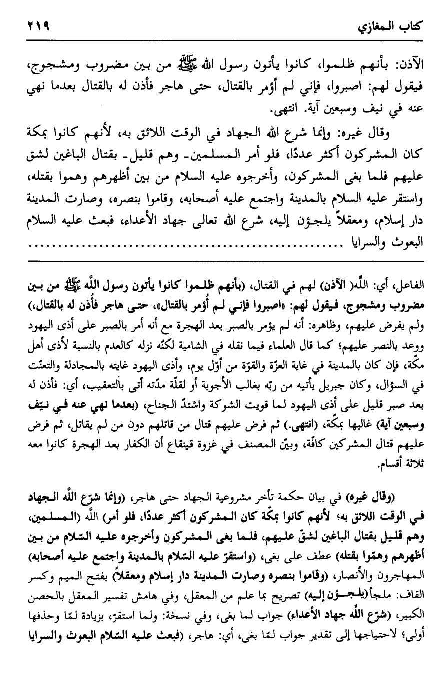 "وقال غيره" في بيان حكمة تأخر مشروعية الجهاد حتى هاجر، "وإنما شرع لله الجهاد في الوقت الائق به؛ لأنهم كانوا بمكة كان المشركون أكثر عددا، فلو أمر" الله "المسلمين وهم قليل بقتال الباغين لشق عليهم، فلما بغى المشركون وأخرجوه عليه السلام من بين أظهرهم وهموا بقتله" عطف على بغي، "واستقر عليه السلام بالمدينة واجتمع عليه أصحابه" المهاجرون والأنصار، "وقاموا بنصره وصارت المدينة دار إسلام ومعقلا" بفتح الميم وكسر القاف: ملجأ "يلجئون إليه" تصريح بما علم من المعقل، وفي هامش تفسير المعقل بالحصن الكبير، "شرع الله جهاد الأعداء" جواب لما بغى، وفي نسخة: ولما استقر، بزيادة لما وحذفها أولى، لاحتياجها إلى تقدير جواب لما بغى، أي: هاجر "فبعث عليه السلام البعوث والسرايا