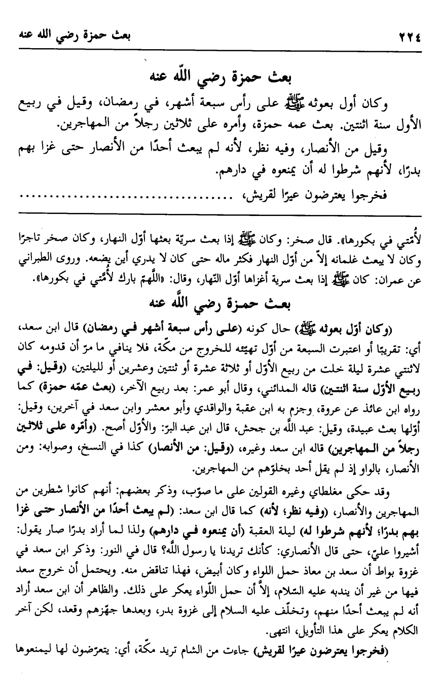 وكان أول بعوثه صلى الله عليه وسلم على رأس سبعة أشهر، في رمضان، وقيل في ربيع الأول سنة اثنتين. بعث عمه حمزة، وأمره على ثلاثين رجلا من المهاجرين.