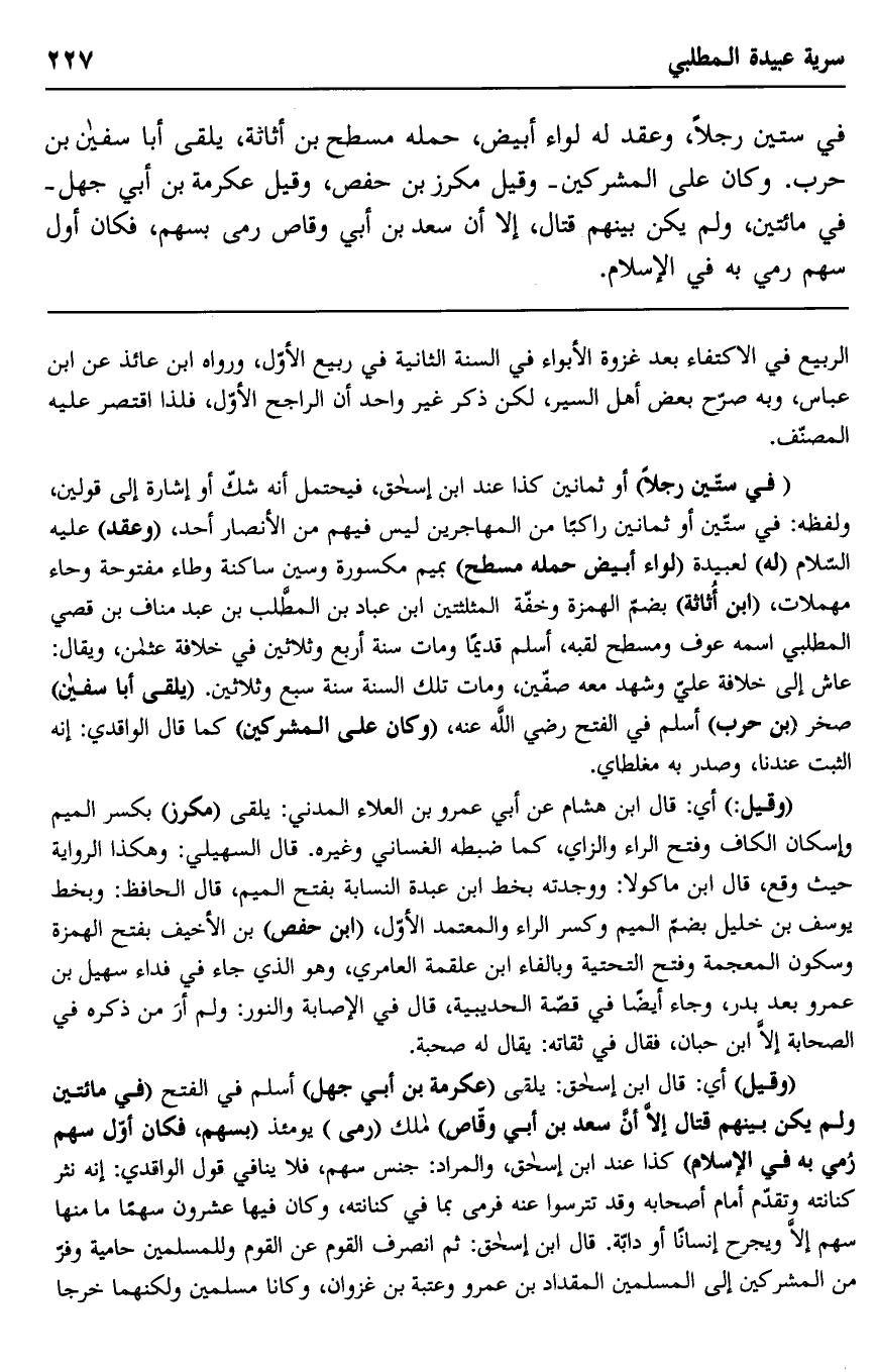 "وقيل" أي: قال ابن إسحاق: يلقى "عكرمة بن أبي جهل" أسلم في الفتح "في مائتين ولم يكن بينهم قتال إلا أن سعد بن أبي وقاص" مالك "رمى" يومئذ "بسهم، فكان أول سهم رمي به في الإسلام" كذا عند ابن إسحاق، والمراد: جنس سهم، فلا ينافي قول الواقدي: إنه نثر كنانته وتقدم أمام أصحابه وقد تترسوا عنه فرمى بما في كنانته، وكان فيها عشرون سهما ما منها سهم إلا ويجرح إنسانا أو دابة. قال ابن إسحاق: ثم انصرف القوم عن القوم وللمسلمين حامية وفر من المشركين إلى المسلمين المقداد بن عمرو وعتبة بن غزوان، وكانا مسلمين ولكنهما خرجا