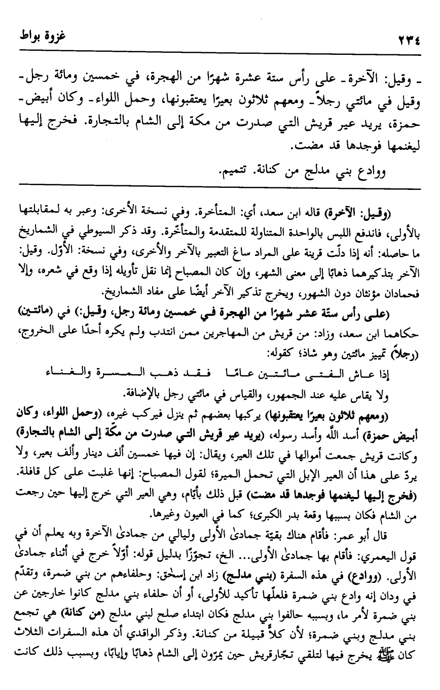 قال أبو عمر: فأقام هناك بقية جمادى الأولى وليالي من جمادى الآخرة وبه يعلم أن في قول اليعمري: فأقام بها جمادى الأولى ... إلخ، تجوزا بدليل قوله: أولا خرج في أثناء جمادى الأولى. "ووادع" في هذه السفرة "بني مدلج" زاد ابن إسحاق: وحلفاؤهم من بني ضمرة، وتقدم في ودان إنه وادع بن ضمرة فلعلها تأكيد للأولى، أو أن حلفاء بن يمدلج كانوا خارجين عن بني ضمرة لأمر ما، وبسببه حالفوا بني مدلج فكان ابتداء صلح لبني مدلج "من كنانة" هي تجمع بني مدلج وبني ضمرة؛ لأن كلا قبيلة من كنانة. وذكر الواقدي أن هذه السفرات الثلاث كان صلى الله عليه وسلم يخرج فيها لتلقي تجار قريش حين يمرون إلى الشام ذهابا وإيابا، وبسبب ذلك كانت