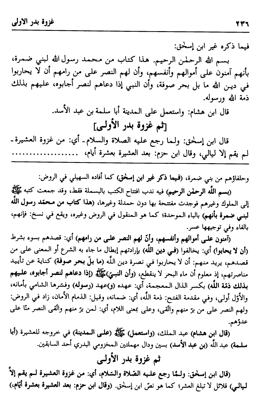 بسم الله الرحمن الرحيم. هذا كتاب من محمد رسول الله لبني ضمرة، بأنهم آمنون على أموالهم وأنفسهم، وأن لهم النصر على من رامهم أن لا يحاربوا في دين الله ما بل بحر صوفة، وأن النبي إذا دعاهم لنصر أجابوه، عليهم بذلك ذمة الله ورسوله.