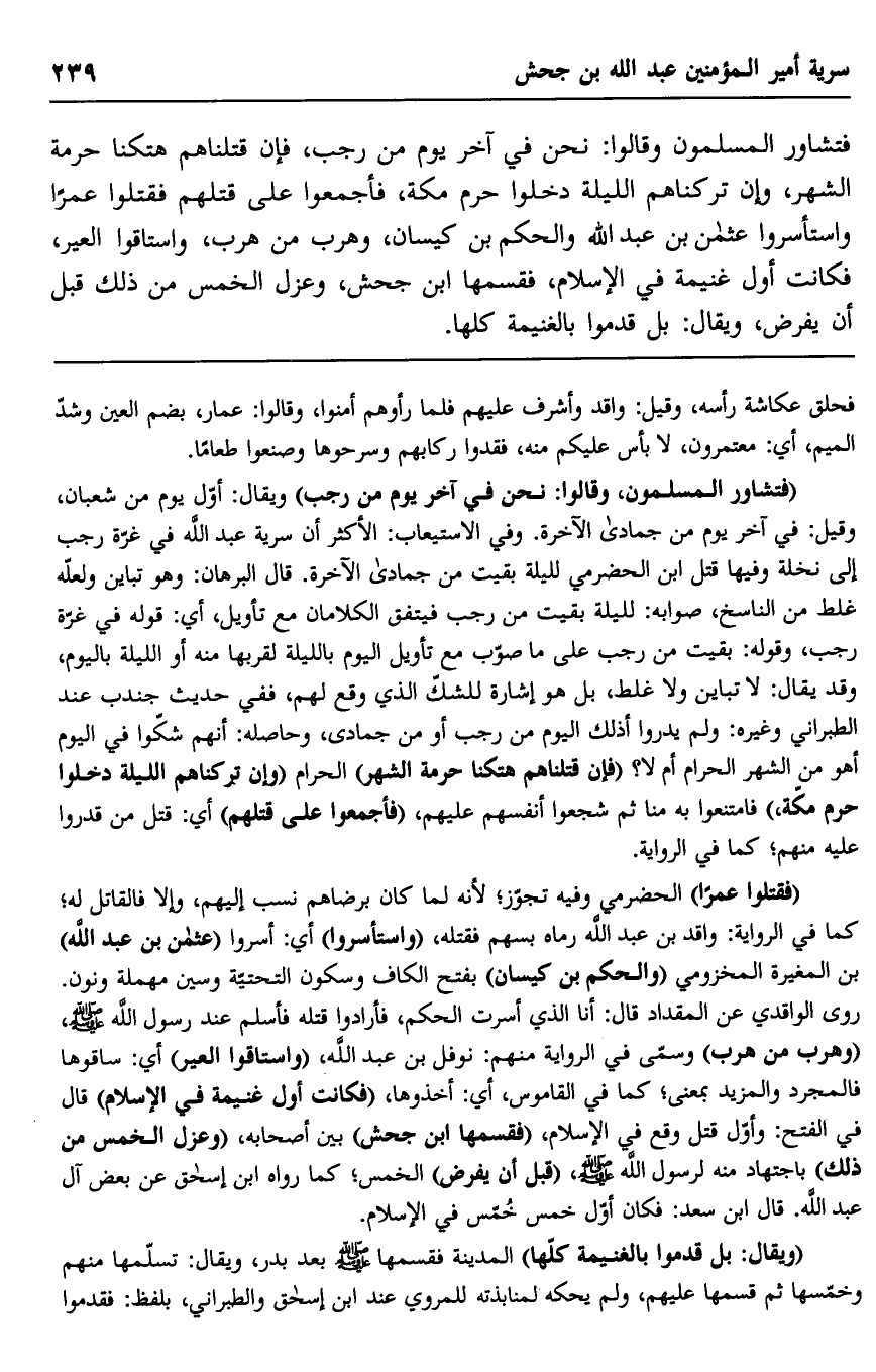 فتشاور المسلمون وقالوا: نحن في آخر يوم من رجب، فإن قتلناهم هتكنا حرمة الشهر، وإن تركناهم الليلة دخلوا حرم مكة، فأجمعوا على قتلهم فقتلوا عمرا واستأسروا عثمان بن عبد الله والحكم بن كيسان، وهرب من هرب، واستاقوا العير، فكانت أول غنيمة في الإسلام، فقسمها ابن جحش، وعزل الخمس من ذلك قبل أن يفرض، ويقال: بل قدموا بالغنيمة كلها.