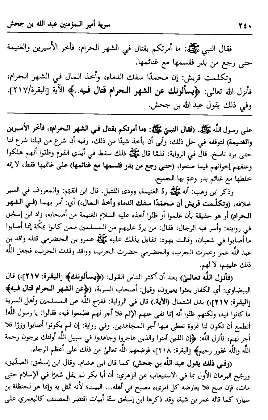 وتكلمت قريش: إن محمدًا سفك الدماء، وأخذ المال في الشهر الحرام، فأنزل الله تعالى: {يَسْأَلُونَكَ عَنِ الشَّهْرِ الْحَرَامِ قِتَالٍ فِيهِ} الآية [البقرة: 217] . وفي ذلك يقول عبد الله بن جحش: