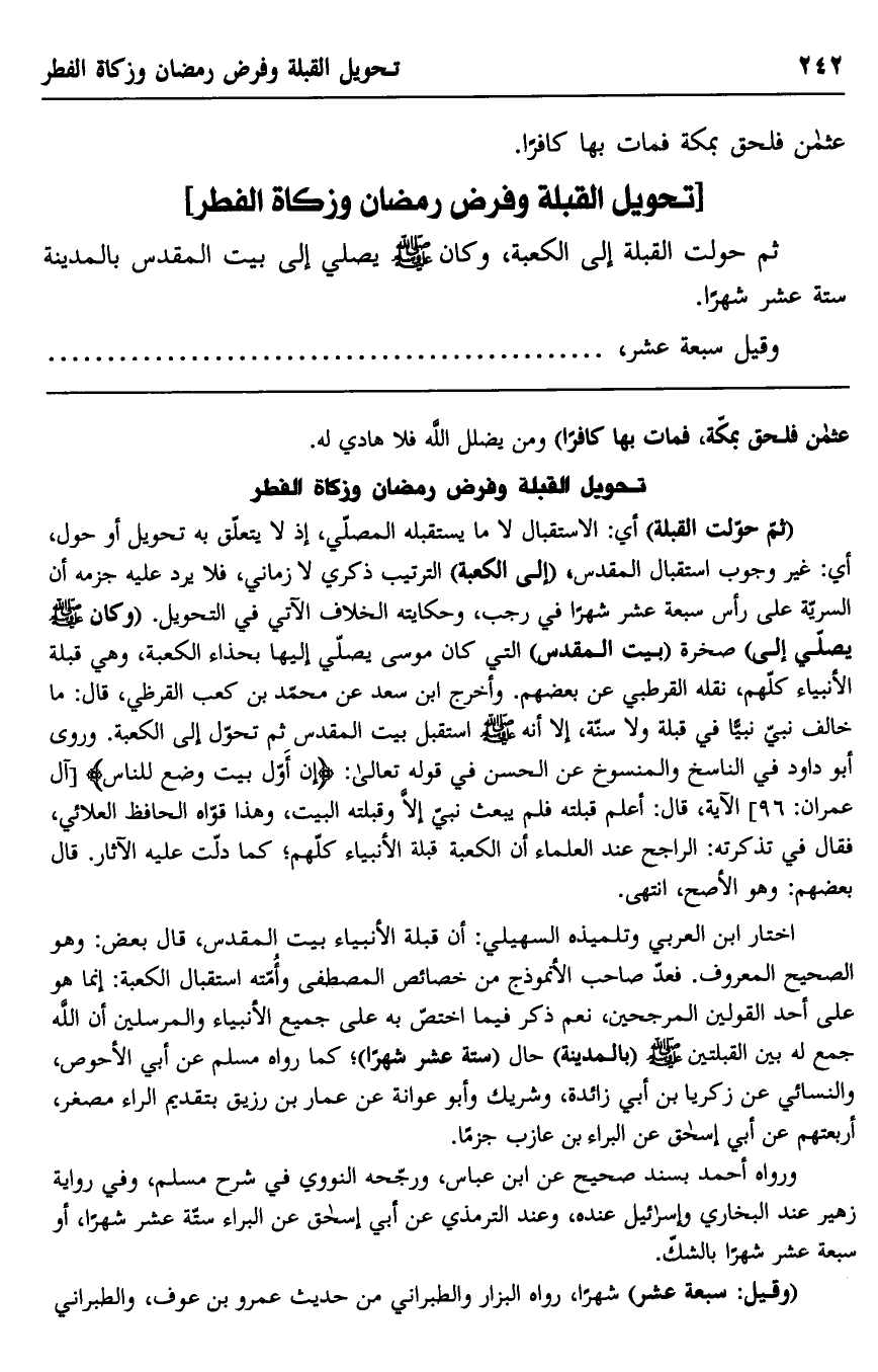 ورواه أحمد بسند صحيح عن ابن عباس، ورجحه النووي في شرح مسلم، وفي رواية زهير عند البخاري وإسرائيل عنده، وعند الترمذي عن أبي إسحاق عن البراء ستة عشر شهرا، أو سبعة عشر شهرا بالشك.