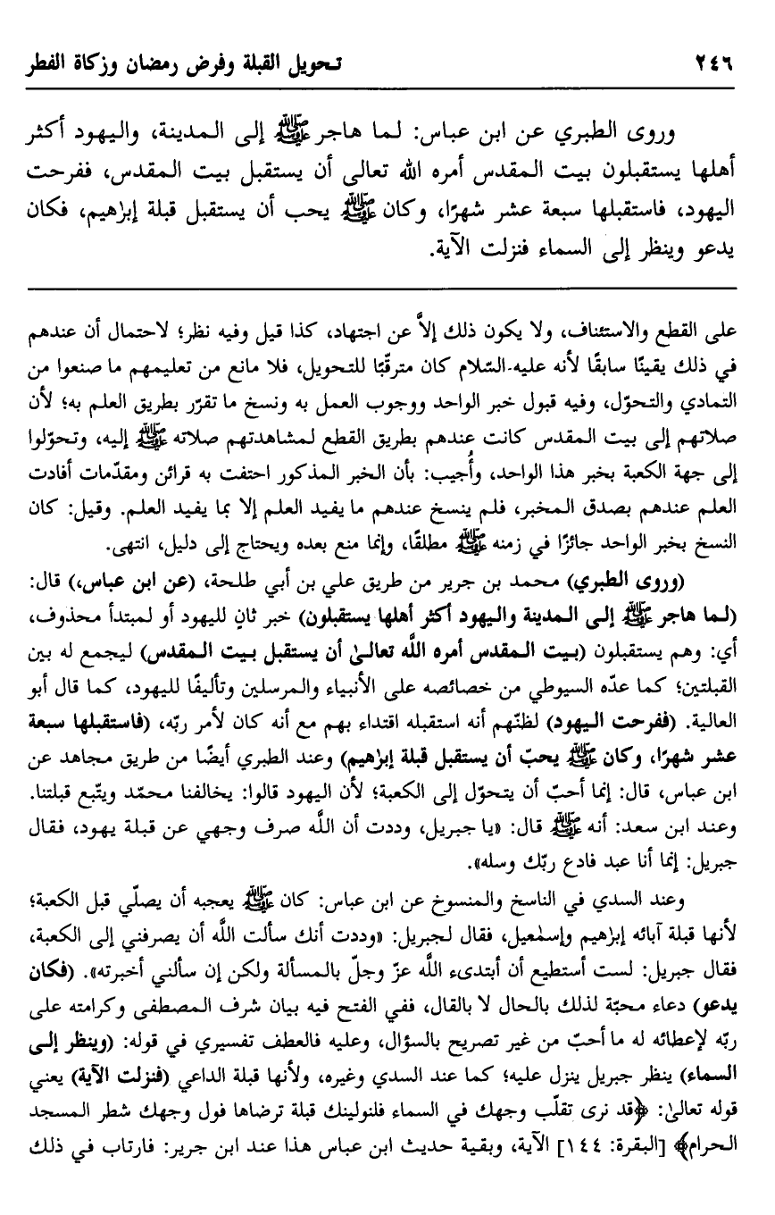 "وروى الطبري" محمد بن جرير من طريق علي بن أبي طلحة، "عن ابن عباس" قال: "لما هجر صلى الله عليه وسلم إلى المدينة واليهود أكثر أهلها يستقبلون" خبر ثان لليهود أو لمبتدأ محذوف، أي: وهم يستقبلون "بيت المقدس أمره الله تعالى أن يستقبل بيت المقدس" ليجمع له بين القبلتين، كما عده السيوطي من خصائصه على الأنبياء والمرسلين وتأليفا لليهود، كما قال أبو العالية "ففرحت اليهود" لظنهم أنه استقبله اقتداء بهم مع أنه كان لأمر ربه "فاستقبلها سبعة عشر شهرا، وكان صلى الله عليه وسلم يحب أن يستقبل قبلة إبراهيم" وعند الطبري أيضا من طريق مجاهد عن ابن عباس، قال: إنما أحب أن يتحول إلى الكعبة؛ لأن اليهود قالوا: يخالفنا محمد ويتبع قبلتنا. وعند ابن سعد: أنه صلى الله عليه وسلم قال: "يا جبريل، وددت أن الله صرف وجهي عن قبلة يهود"، فقال جبريل: إنما أنا عبد فادع ربك وسله.