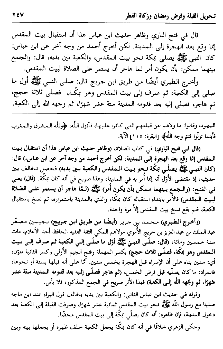 "وأخرج الطبري" محمد بن جرير "أيضا من طريق ابن جريج" بجيمين مصغر عبد الملك بن عبد العزيز بن جريج الأموي مولاهم المكي الثقة الفقيه الحافظ أحد الأعلام، مات سنة خمسين ومائة، "قال: صلى النبي صلى الله عليه وسلم أول ما صلى إلى الكعبة ثم صرف إلى بيت المقدس وهو بمكة، فصلى ثلاثة حجج" بكسر المهملة وفتح الجيم الأولى وكسر الثانية منون، أي: سنين بناء على أن الإسراء قبل الهجرة بخمس سنين. أما على أنه قبلها بسنة أو نحوها، فالمراد: ما كان يصليه قبل فرض الخمس، "ثم هاجر فصلى إليه بعد قدومه المدينة ستة عشر شهرا، ثم وجهه الله إلى الكعبة" فهذا الأثر صريح في الجمع المذكور، فلا بأس.