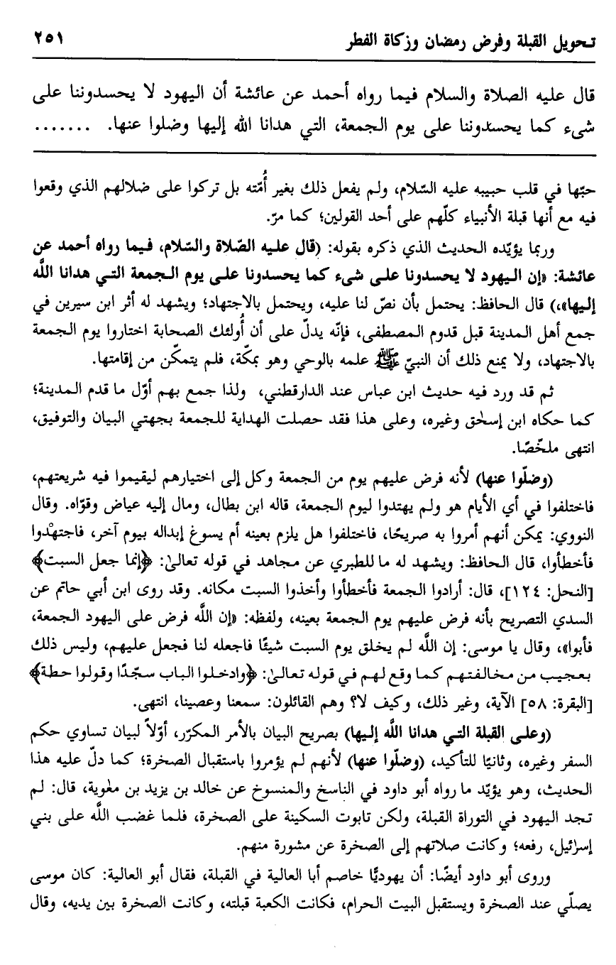 "وعلى القبلة التي هدانا الله إليها" بصريح البيان بالأمر المكرر، أولا لبيان تساوي حكم السفر وغيره، وثانيا للتأكيد، "وضلوا عنها" لأنهم لم يؤمروا باستقبال الصخرة، كما دل عليه هذا الحديث، وهو يؤيد ما رواه أبو داود في الناسخ والمنسوخ عن خالد بن يزيد بن معاوية قال: لم تجد اليهود في التوراة القبلة، ولكن تابوت السكينة على الصخرة، فلما غضب الله على بني إسرائيل رفعه، وكانت صلاتهم إلى الصخرة عن مشورة منهم.