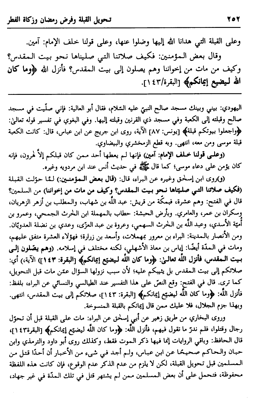 وروى البخاري من طريق زهير عن أبي إسحاق عن البراء: مات على القبلة قبل أن تحول رجال وقتلوا، فلم ندر ما نقول فيهم، فأنزل الله: {وَمَا كَانَ اللَّهُ لِيُضِيعَ إِيمَانَكُمْ} [البقرة: 143] ، قال الحافظ: وباقي الروايات إنما فيها ذكر الموت فقط، وكذلك روى أبو داود والترمذي وابن حبان والحاكم صحيحا عن ابن عباس، ولم أجد في شيء من الأخبار أن أحدًا قتل من المسلمين قبل تحويل القبلة، لكن لا يلزم من عدم الذكر عدم الوقوع، فإن كانت هذه اللفظة محفوظة، فتحمل على أن بعض المسلمين ممن لم يشتهر قتل في تلك المدة في غير جهاد،