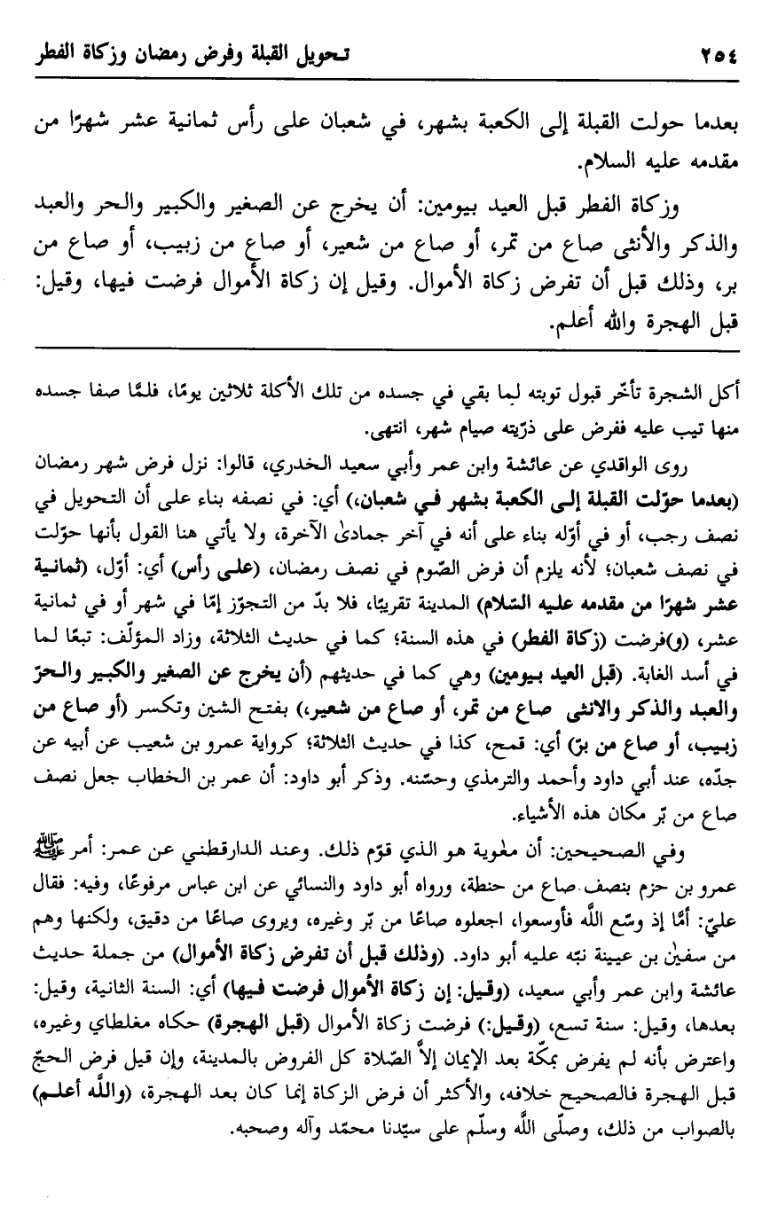 روى الواقدي عن عائشة وابن عمر وأبي سعيد الخدري، قالوا: نزل فرض شهر رمضان "بعدما حولت القبلة إلى الكعبة بشهر في شعبان،" أي: في نصفه بناء على أن التحويل في نصف رجب، أو في أوله بناء على أنه في آخر جمادى الآخرة، ولا يأتي هنا القول بأنها حولت في نصف شعبان؛ لأنه يلزم أن فرض الصوم في نصف رمضان، "على رأس" أي: أول، "ثمانية عشر شهرا، من مقدمة عليه السلام" المدينة تقريبا، فلا بد من التجوز إما في شهر أو في ثمانية عشر، "و" فرضت "زكاة الفطر" في هذه السنة، كما في حديث الثلاثة، وزاد المؤلف: تبعا لما في أسد الغابة. "قبل العيد بيومين" وهي كما في حديثهم "أن يخرج عن الصغير والكبير والحر والعبد والذكر والأنثى صاع من تمر، أو صاع من شعير" بفتح الشين وتكسر "أو صاع من زبيب، أو صاع من بر" أي: قمح، كذا في حديث الثلاثة، كرواية عمرو بن شعيب عن أبيه عن جده، عند أبي داود وأحمد والترمذي وحسنه. وذكر أبو داود: أن عمر بن الخطاب جعل نصف صاع من بر مكان هذه الأشياء.