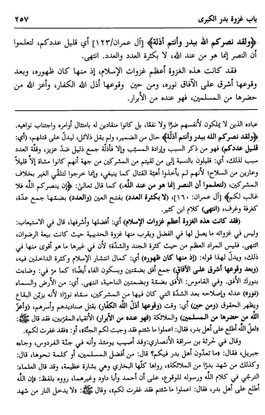 وقال في حارثة بن سراقة الأنصاري: وقد أصيب يومئذ وأنه في جنة الفردوس وجاءه جبريل، فقال: "ما تعدون أهل بدر فيكم؟ قال: من أفضل المسلمين، أو كلمة نحوها، قال: وكذلك من شهد بدرا من الملائكة"، رواها البخاري وهي بشارة عظيمة، وقد قال العلماء: الترجي في كلام الله ورسوله للوقوع، على أن أحمد وأبا داود وغيرهما، ورووه بلفظ: "إن الله أطلع على أهل بدر، فقال: اعملوا ما شئتم فقد غفرت لكم"، وقال صلى الله عليه وسلم: "لا يدخل النار من شهد