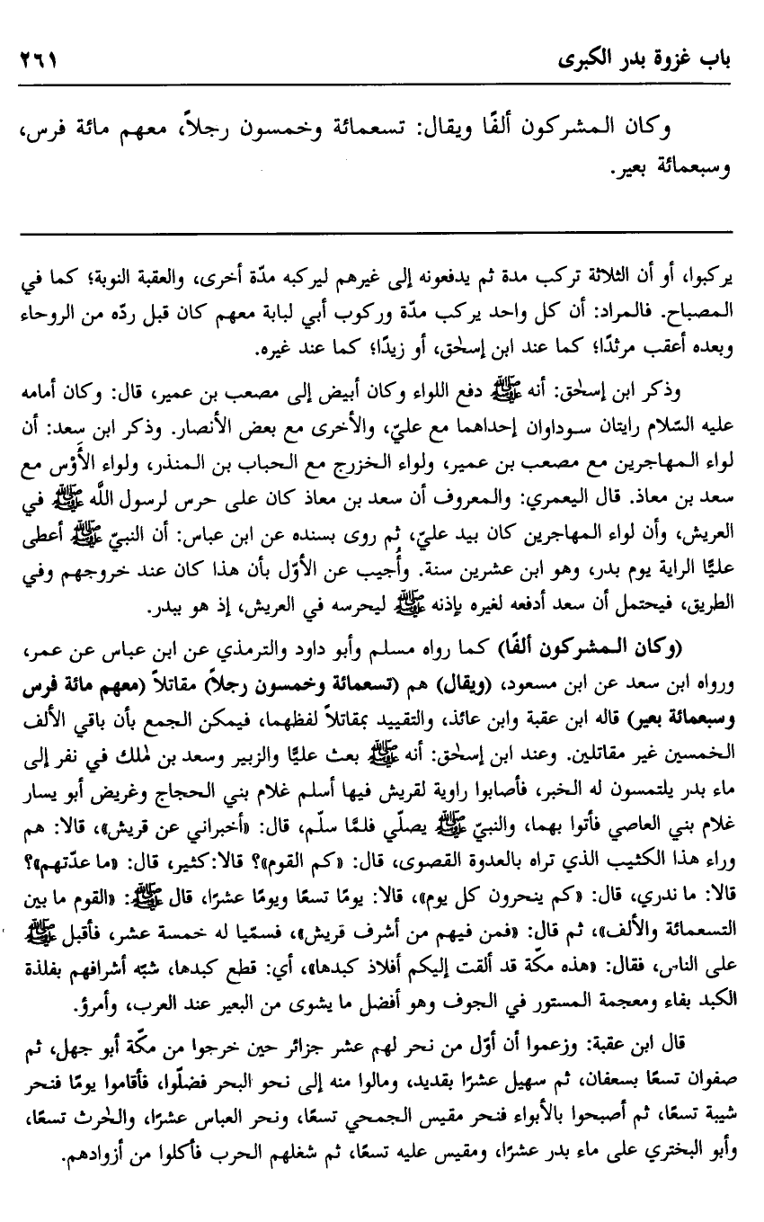 وذكر ابن إسحاق: أنه صلى الله عليه وسلم دفع اللواء وكان أبيض إلى مصعب بن عمير، قال: وكان أمامه عليه السلام رايتان سوداوان بن عمير، ولواء الخزرج مع الحباب بن المنذر ولواء الأوس مع سعد بن معاذ. قال اليعمري: والمعروف أن سعد بن معاذ كان على حرس لرسول الله صلى الله عليه وسلم في العريش، وأن لواء المهاجرين كان بيد علي ثم روى بسنده عن ابن عباس: أن النبي صلى الله عليه وسلم أعطى عليا الراية يوم بدر، وهو ابن عشرين سنة. وأجيب عن الأول بأن هذا كان عند خروجهم وفي الطريق، فيحتمل أن سعد لغيره أدفعه لغيره بإذنه صلى الله عليه وسلم ليحرسه في العريش، إذ هو ببدر.