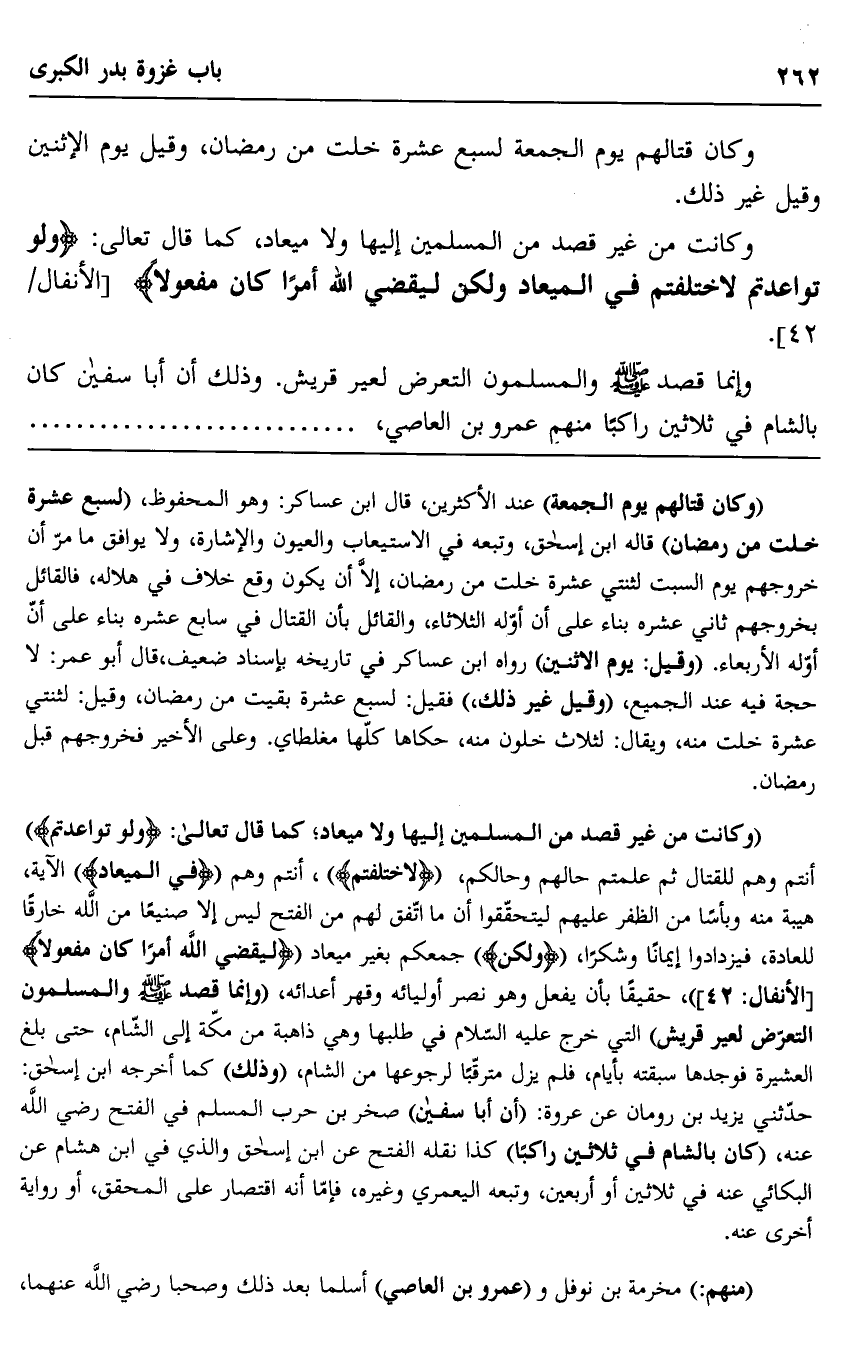 "وكانت من غير قصد من المسلمين إليها ولا ميعاد، كما قال تعالى: {وَلَوْ تَوَاعَدْتُمْ} أنتم وهم للقتال ثم علمتم حالهم وحالكم، {لَاخْتَلَفْتُم} ، أنتم وهم {فِي الْمِيعَاد} الآية، هيبة منه وبأسا من الظفر علهم ليتحققوا أن ما اتفق لهم من الفتح ليس إلا صنيعا من الله خارقا للعادة، فيزدادوا إيمانا وشكرا، {وَلَكِنْ} جمعكم بغير ميعاد {لِيَقْضِيَ اللَّهُ أَمْرًا كَانَ مَفْعُولًا} [الأنفال: 42] حقيقا بأن يفعل وهو نصر أوليائه وقهر أعدائه، "وإنما قصد صلى الله عليه وسلم والمسلمون التعرض لعير قريش" التي خرج عليه السلام في طلبها وهي ذاهبة. من مكة إلى الشام، حتى بلغ العشيرة فوجدها سبقته بأيام، فلم يزل مترقبا لرجوعها من الشام، "وذلك" كما أخرجه ابن إسحاق: حدثني يزيد بن رومان عن عروة: "أن أبا سفيان" صخر بن حرب المسلم في الفتح رضي الله عنه، "كان بالشام في ثلاثين راكبا" كذا نقله الفتح عن ابن إسحاق والذي في ابن هشام عن البكائي عنه في ثلاثين أو أربعين، وتبعه اليعمري وغيره، فإما أنه اقتصار على المحقق، أو رواية أخرى عنه.