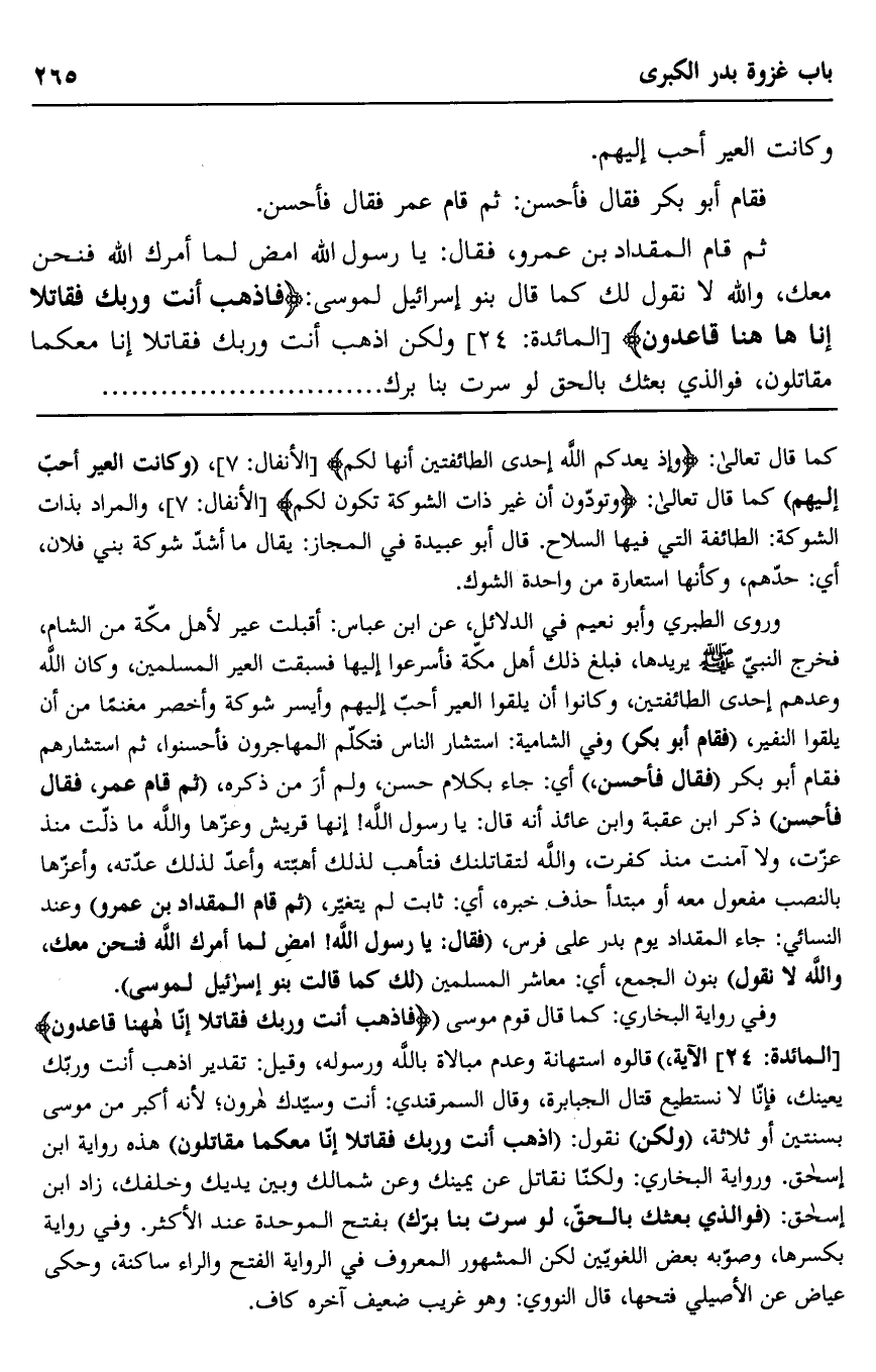 ثم قام المقداد بن عمرو، فقال: يا رسول الله امض لما أمرك الله فنحن معك، والله لا نقول لك كما قال بنو إسرائيل لموسى: {فَاذْهَبْ أَنْتَ وَرَبُّكَ فَقَاتِلَا إِنَّا هَاهُنَا قَاعِدُونَ} [المائدة: 24] ولكن اذهب أنت وربك فقاتلا إنا معكما مقاتلون، فوالذي بعثك بالحق لو سرت بنا برك...........................