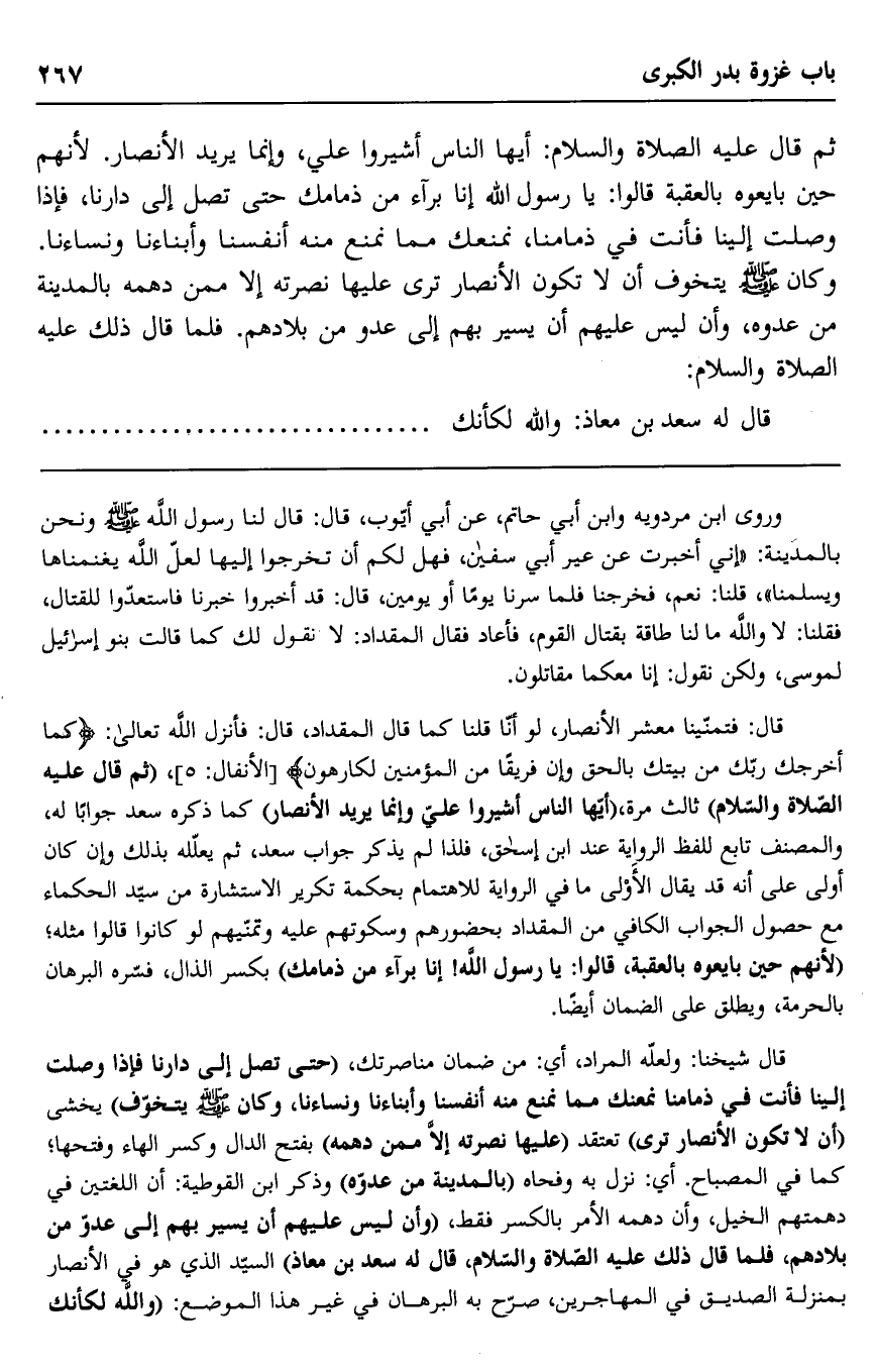 ثم قال عليه الصلاة والسلام: "أيها الناس أشيروا عليَّ"، وإنما يريد الأنصار. لأنهم حين بايعوه بالعقبة قالوا: يا رسول الله إنا برآء من ذمامك حتى تصل إلى دارنا، فإذا وصلت إلينا فأنت في ذمامنا، نمنعك مما نمنع منه أنفسنا وأبناءنا ونساءنا. وكان صلى الله عليه وسلم يتخوف أن لا تكون الأنصار ترى عليها نصرته إلا ممن دهمه بالمدينة من عدوه، وأن ليس عليهم أن يسير بهم إلى عدو من بلادهم. فلما قال ذلك عليه الصلاة والسلام: