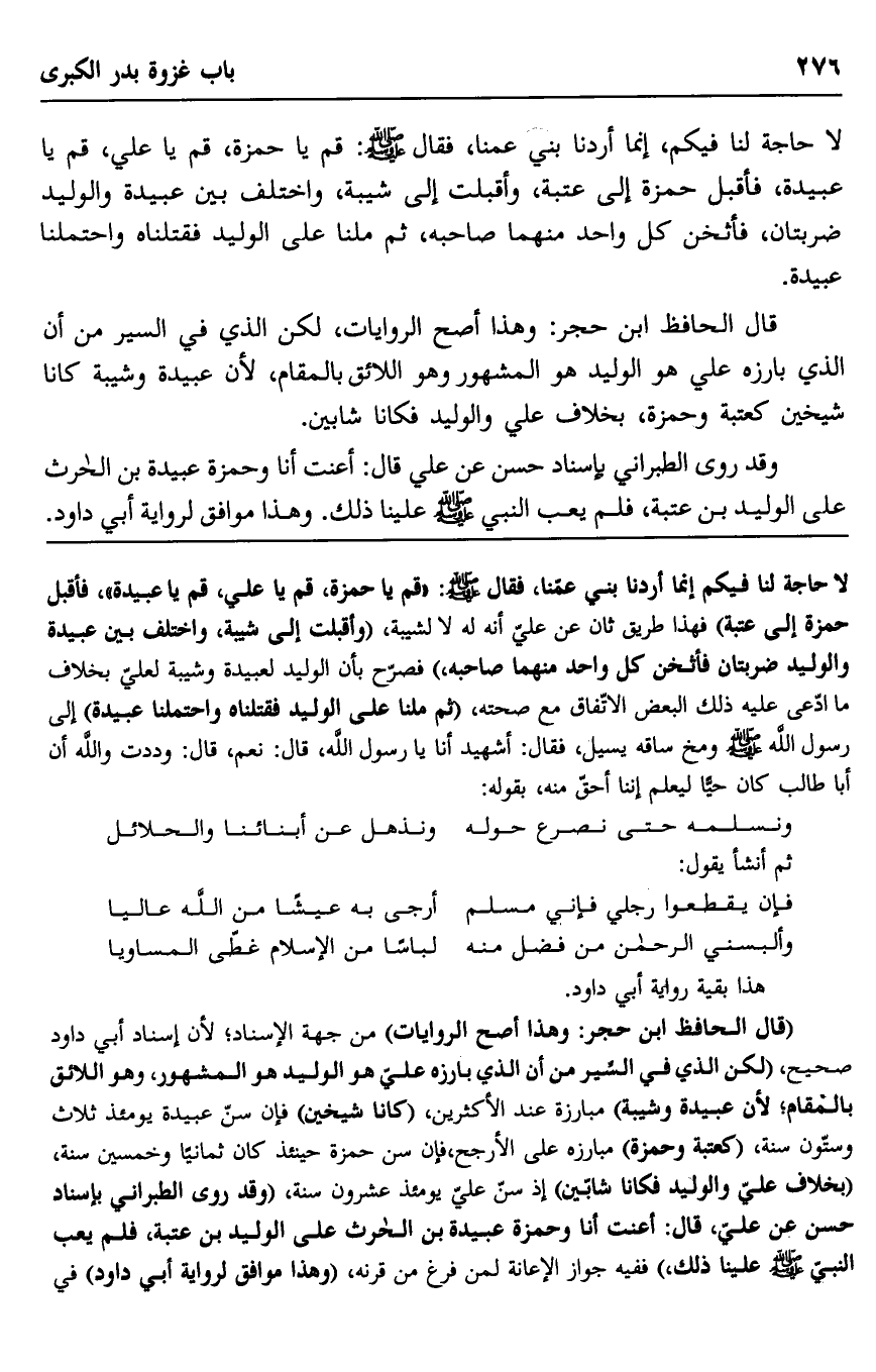 لا حاجة لنا فيكم، إنما أردنا بني عمنا، فقال صلى الله عليه وسلم: "قم يا حمزة، قم يا علي، قم يا عبيدة"، فأقبل حمزة إلى عتبة، وأقبلت إلى شيبة، واختلف بين عبيدة والوليد ضربتان، فاثخن كل واحد منهما صاحبه، ثم ملنا على الوليد فقتلناه واحتملنا عبيدة.