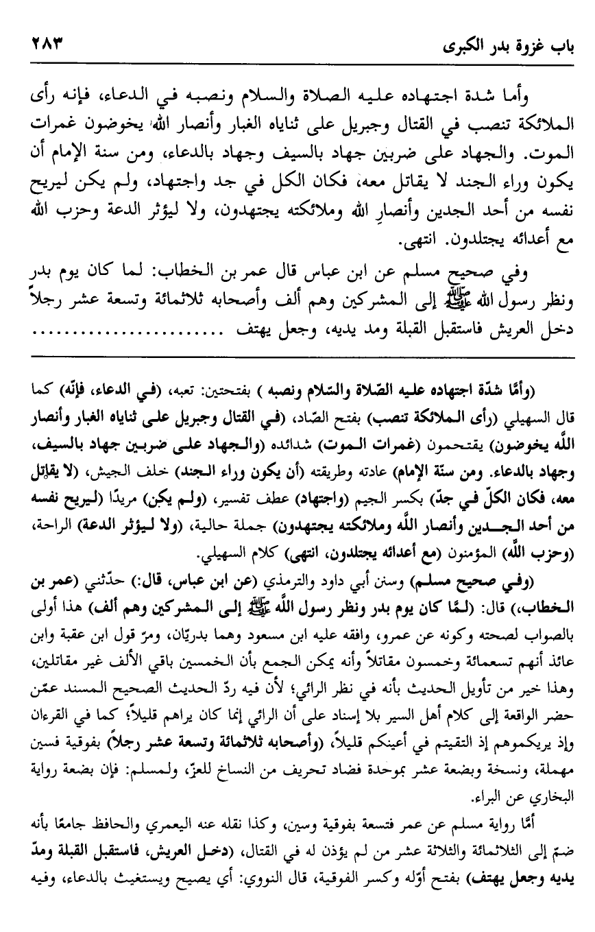 وفي صحيح مسلم عن ابن عباس قال عمر بن الخطاب: لما كان يوم بدر ونظر رسول الله صلى الله عليه وسلم إلى المشركين وهم ألف وأصحابه ثلاثمائة وتسعة عشر رجلا دخل العريش فاستقبل القبلة ومد يديه، وجعل يهتف..............................