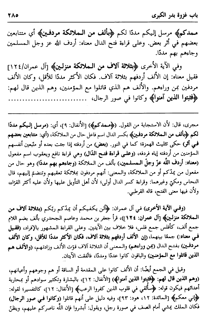 "وفي الآية الأخرى" في آل عمران: {أَلَنْ يَكْفِيَكُمْ أَنْ يُمِدَّكُمْ رَبُّكُمْ بِثَلَاثَةِ آلَافٍ مِنَ الْمَلَائِكَةِ مُنْزَلِينَ} [آل عمران: 124] "، قرأ جعفر بن محمد وعاصم الجحدري بألف بضم اللام جمع ألف، كفلس جمع فلس، فلا خلاف بين الآيتين، وعلى القراءة المشهور بالإفراد، "فقيل في معناه:" جمعا بينهما، "إن الألف أردفهم بثلاثة آلاف، فكان الأكثر مددا للأقل، وكان الألف مردفين" بفتح الدال "بمن وراءهم" والمعنى أن الثلاثة آلاف قوت الألف وزادتهم، "والألف هم الذين قاتلوا مع المؤمنين" والباقون كانوا عددا ومددا، فاتفقت الآيتان.