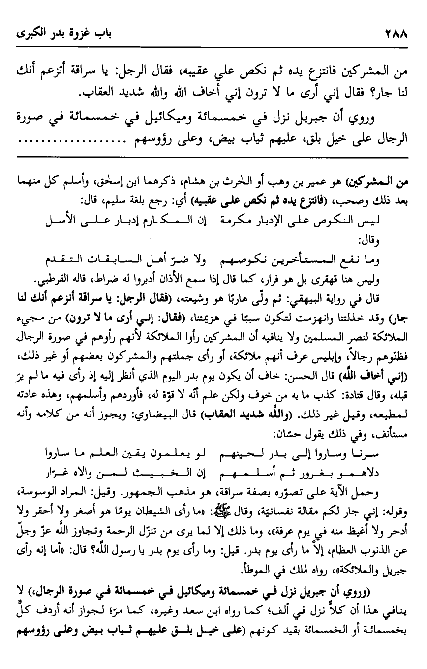 من المشركين فانتزع يده ثم نكص على عقيبه، فقال الرجل: يا سراقة أتزعم أنك لنا جار؟ فقال إني أرى ما لا ترون إني أخاف الله والله شديد العقاب.
