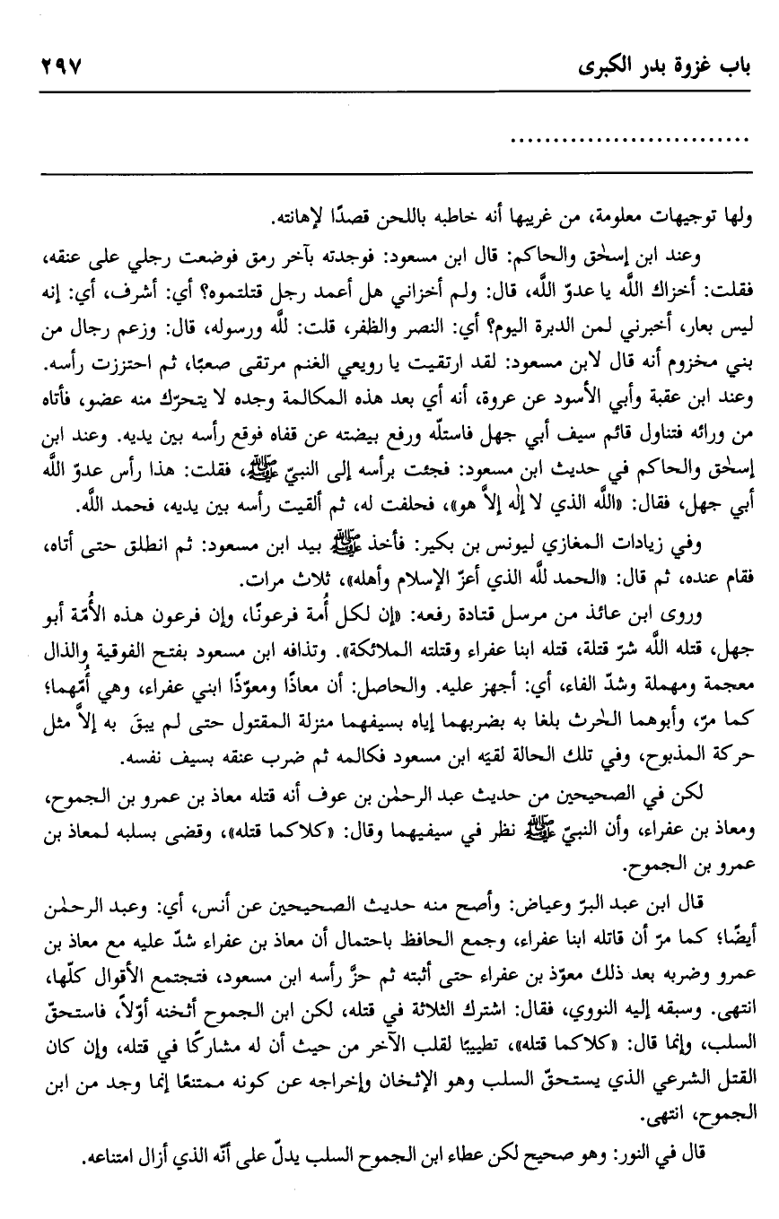وعند ابن إسحاق والحاكم: قال ابن مسعود: فوجدته بآخر رمق فوضعت رجلي على عنقه، فقلت: أخزاك الله يا عدو الله، قال: ولم أخزاني هل أعمد رجل قتلتموه؟ أي: أشرف، أي: إنه ليس بعار، أخبرني لمن الدبرة اليوم؟ أي: النصر والظفر، قلت: لله ورسوله، قال: وزعم رجال من بني مخزوم أنه قال لابن مسعود: لقد ارتقيت يا رويعي الغنم مرتقى صعبا، ثم احترزت رأسه. وعند ابن عقبة وأبي الأسود عن عروة، أنه أي بعد هذه المكالمة وجده لا يتحرك منه عضو، فأتاه من ورائه فتناول قائم سيف أبي جهل فاستله ورفع بيضته عن قفاه فوقع رأسه بين يديه. وعند ابن إسحاق والحاكم في حديث ابن مسعود: فجئت برأسه إلى النبي صلى الله عليه وسلم فقلت: هذا رأس عدو الله أبي جهل، فقال: "الله الذي لا إله إلا هو" فحلفت له، ثم ألقيت رأسه بين يديه، فحمد الله.