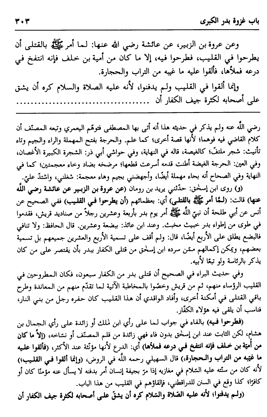 وعن عروة بن الزبير، عن عائشة رضي الله عنها: لما أمر صلى الله عليه وسلم بالقتلى أن يطرحوا في القليب، فطرحوا فيه، إلا ما كان من أمية بن خلف فإنه انتفخ في درعه فملأها، فألقوا عليه ما غيبه من التراب والحجارة.