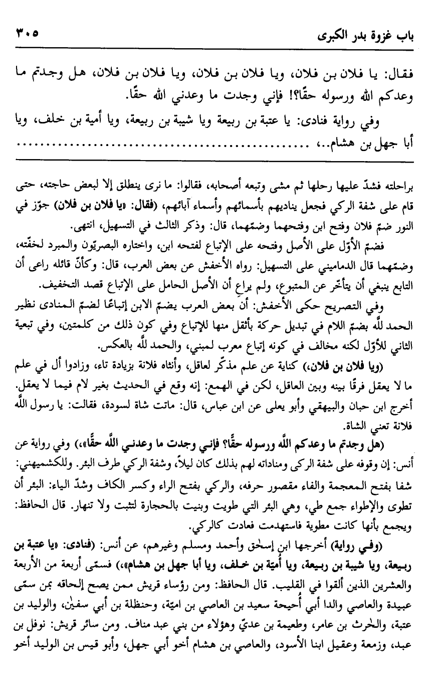 براحلته فشد عليها رحلها ثم مشى وتبعه أصحابه، فقالوا: ما نرى ينطلق إلا لبعض حاجته، حتى قام على شفة الركي فجعل يناديهم بأسمائهم وأسماء آبائهم، "فقال: "يا فلان بن فلان" جوز في النور ضم فلان وفتح ابن وفتحهما وضمهما، قال: وذكر الثالث في التسهيل، انتهى.