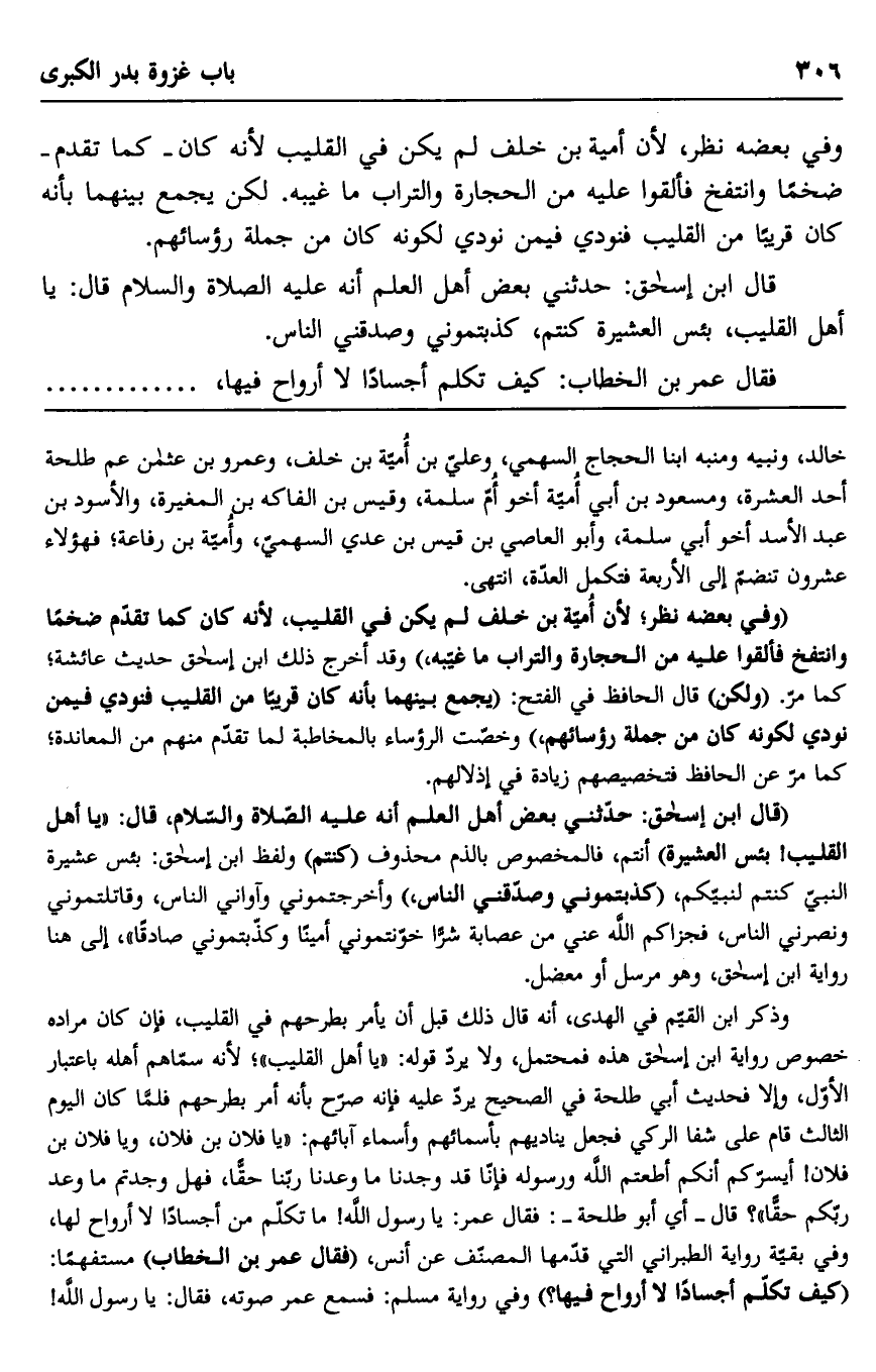 وذكر ابن القيم في الهدي، أنه قال ذلك قبل أن يأمر بطرحهم في القليب، فإن كان مراده خصوص رواية ابن إسحاق هذه فمحتمل، ولا يرد قوله: "يا أهل القليب" لأنه سماهم أهله باعتبار الأول، وإلا فحديث أبي طلحة في الصحيح يرد عليه فإن صرح بأنه أمر بطرحهم فلما كان اليوم الثالث قام على شفا الركي فجعل يناديهم بأسمائهم وأسماء آبائه: "يا فلان بن فلان، ويا فلان بن فلان 1 أيسركم أنكم أطعتم الله ورسوله فإنا قد وجدنا ما وعدنا ربنا حقا، فهل وجدتم ما وعد ربكم حقا" قال -أي أبو طلحة: فقال عمر: يا رسول الله! ما تكلم من أجساد لا أرواح لها، وفي بقية رواية الطبراني التي قدمها المصنف عن أنس، "فقال عمر بن الخطاب" مستفهما: "كيف تكلم أجسادا لا أرواح فيها؟ " وفي رواية مسلم: فسمع عمر صوته، فقال: يا رسول الله!