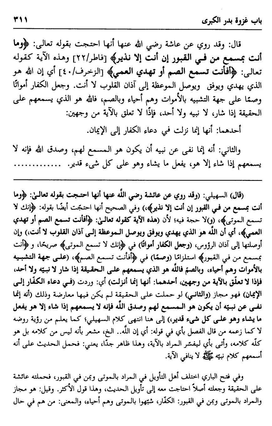 "قال" السهيلي: "وقد روي عن عائشة رضي الله عنها أنها احتجت بقوله تعالى: {وَمَا أَنْتَ بِمُسْمِعٍ مَنْ فِي الْقُبُورِ، إِنْ أَنْتَ إِلَّا نَذِيرٌ} وفي الصحيح أنها احتجت أيضا بقوله: {إِنَّكَ لَا تُسْمِعُ الْمَوْتَى} ، "و" لا حجة فيه؛ لأن "هذه الآية كقوله تعالى: {أَفَأَنْتَ تُسْمِعُ الصُّمَّ أَوْ تَهْدِي الْعُمْي} ، أي أن الله هو الذي يهدي ويوفق ويوصل الموعظة إلى آذان القلوب لا أنت" وإن أوصلتها إلى آذان الرءوس، "وجعل الكفار أمواتا" في {إِنَّكَ لَا تُسْمِعُ الْمَوْتَى} صريحا، و {أَنْتَ بِمُسْمِعٍ مَنْ فِي الْقُبُور} استلزاما "وصما" في {أَفَأَنْتَ تُسْمِعُ الصُّمَّ} ، "على جهة التشبيه بالأموات وهم أحياء، وبالضم فالله هو الذي يسمعهم على الحقيقة إذا شاء لا نبيه ولا أحد، فإذًا لا تعلق بالآية من وجهين، أحدهما: أنها إنما نزلت" أي: وردت "في دعاء الكفار إلى الإيمان" فهو مجاز "والثاني" لو حملت على الحقيقة لم يكن فيها معارضة وذلك "أنه إنما نفى عن نبيه أن يكون هو المسمع لهم وصدق الله فإنه لا يسمعهم إذا شاء إلا هو يفعل ما يشاء وهو على كل شيء قدير" إلى هنا انتهى كلام السهيلي، كما يعلم من رؤية روضه لا كما زعمه من قال الفصل بأي في قوله: أي إن الله..إلخ، مشعر بأنه ليس من كلامه بل هو كله كلامه، وأتى بأي ليفسر المراد بالآية، وهذا ظاهر جدا، يعني: فحمل الحديث على أنه أسمعهم كلام نبيه صلى الله عليه وسلم لا ينافي الآية.