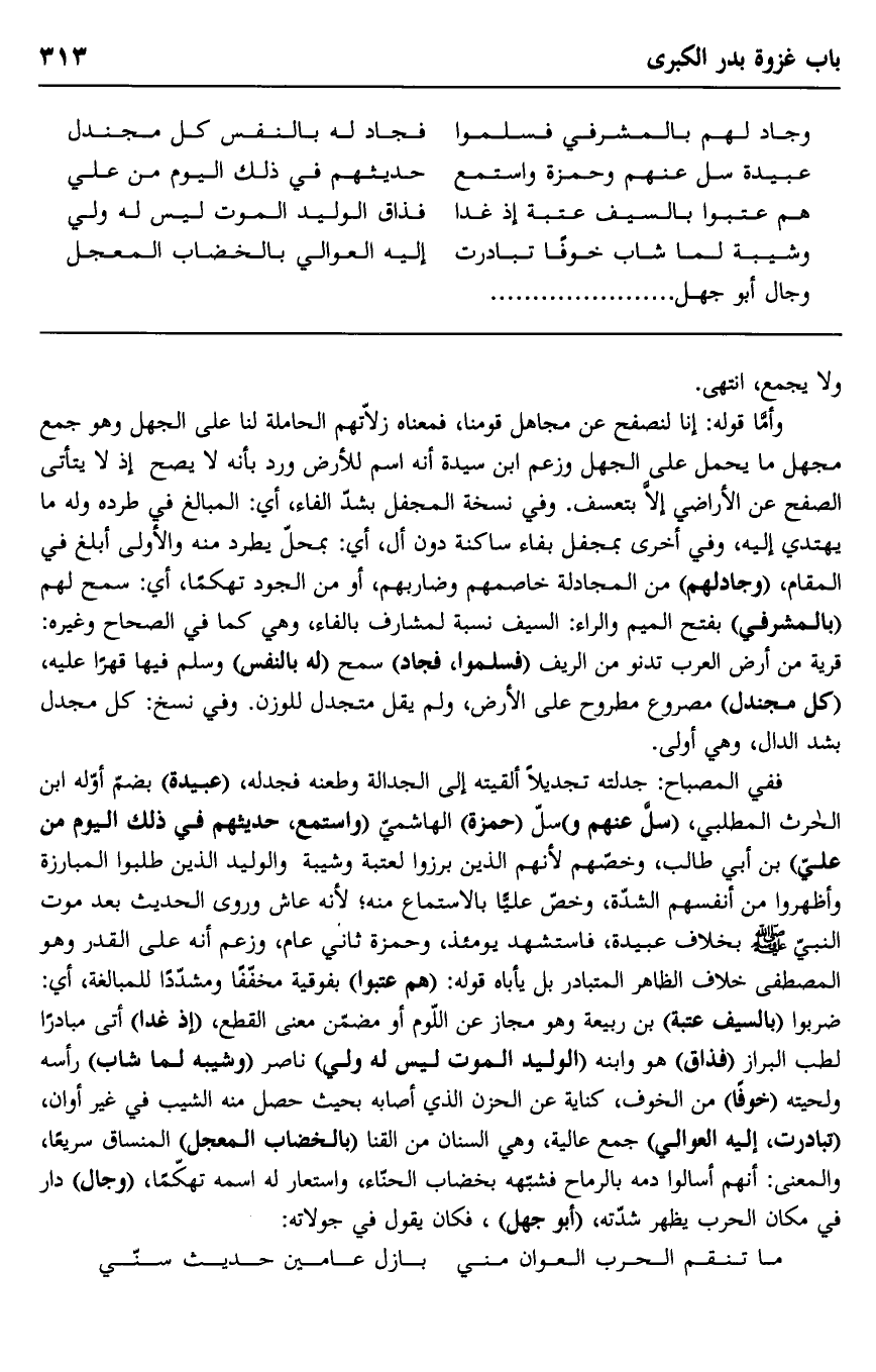 ففي المصباح: جدته تجديلا ألقيته إلى الجدالة وطعنه فجدله، "عبيدة" بضم أوله ابن الحارث المطلبي، "سل عنهم و" سل "حمزة" الهاشمي "واستمع، حديثهم في ذلك اليوم من علي" بن أبي طالب، وخصهم لأنهم الذين برزوا لعتبة وشيبة والوليد الذين طلبوا المبارزة وأظهروا من أنفسهم الشدة، وخص عليا بالاستماع منه؛ لأنه عاش وروى الحديث بعد موت النبي صلى الله عليه وسلم بخلاف عبيدة، فاستشهد يومئذ، وحمزة ثاني عام، وزعم أنه على القدر، وهو المصطفى خلاف الظاهر المتبادر بل يأباه قوله: "هم عتبوا" بفوقية مخففا ومشددا للمبالغة، أي: ضربوا "بالسيف عتبة" بن ربيعة وهو مجاز عن اللوم أو مضمن معنى القطع، "إذ غدا" أتى مبادرا لطب البراز "فذاق" هو وابنه "الوليد الموت ليس له ولي" ناصر "وشيبه لما شاب" رأسه ولحيته "خوفا" من الخوف، كناية عن الحزن الذي أصابه بحيث حصل منه الشيب في غير أوان، "تباردت، إليه العوالي" جمع عالية، وهي السنن من القنا "بالخضاب المعجل" المنساق سريعا، والمعنى: أنهم أسالوا دمه بالرماح فشبهه بخضاب الحناء، واستعار له اسمه تهكما، "وجال" دار في مكن الحرب يظهر شدته، "أبو جهل"، فكان يقول في جولاته: