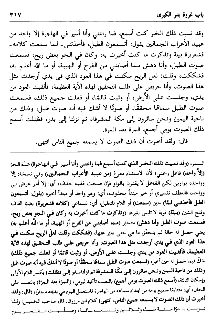 وقد نسب ذلك الخبر كنت أسمع، فما راعني وأنا أسير في الهاجرة إلا واحد من عبيد الأعراب الجمالين يقول: أتسمعون الطبل، فأخذتني -لما سمعت كلامه- قشعريرة بينة وتذكرت ما كنت أخبرت به، وكان في الجو بعض ريح، فسمعت صوت الطبل، وأنا دهش مما أصابني من الفرح أو الهيبة، أو ما الله أعلم به، فشككت، وقلت: لعل الريح سكنت في هذا العود الذي في يدي أوجدت مثل هذا الصوت، وأنا حريص على طلب التحقيق لهذه الآية العظيمة، فألقيت العود من يدي، وجلست على الأرض، أو وثبت قائما، أو فعلت جميع ذلك، فسمعت صوت الطبل سماعا محققا، أو صوتا لا أشك فيه أنه صوت طبل، وذلك من ناحية اليمين ونحن سائرون إلى مكة المشرفة، ثم نزلنا إلى بدر، فظللت أسمع ذلك الصوت يومي أجمع، المرة بعد المرة.