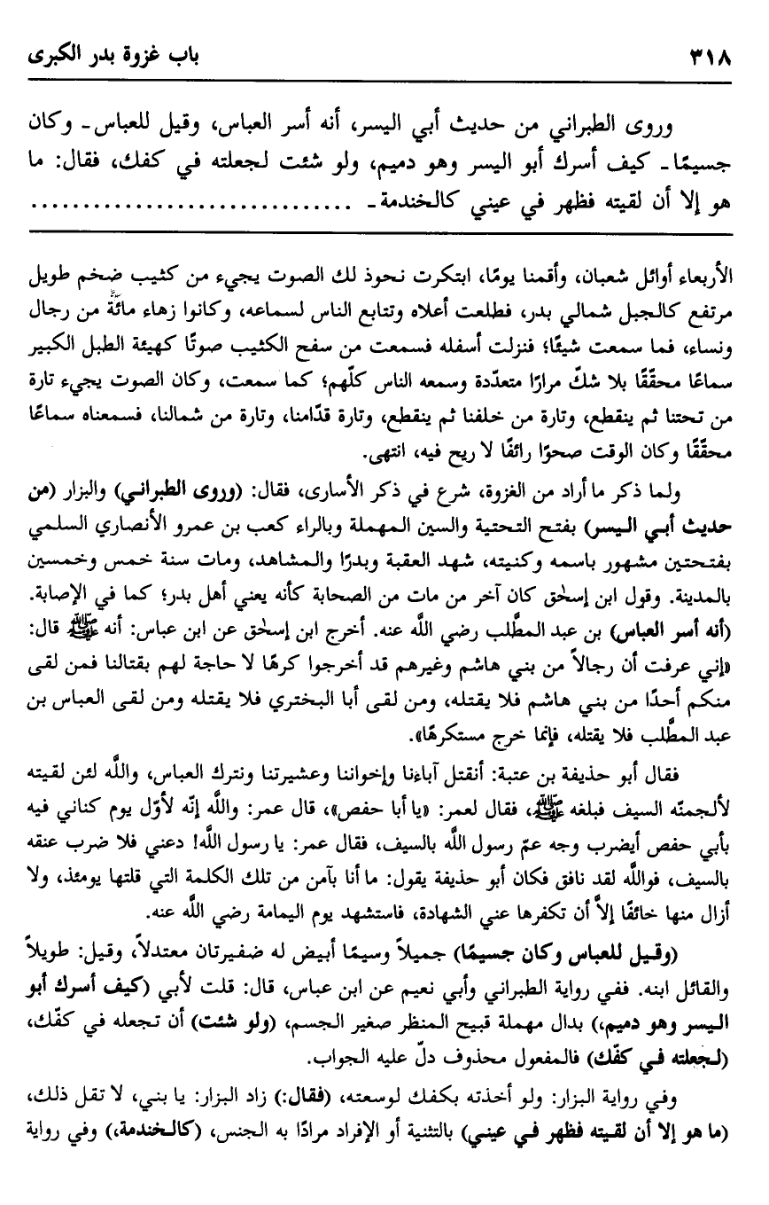 ولما ذكر ما أراد من الغزوة، في ذكر الأساري، فقال: "وروى الطبراني" والبزار "من حديث أبي اليسر" بفتح التحتية والسين المهملة وبالراء كعب بن عمرو الأنصاري السلمي بفتحتين مشهور باسمه وكنيته، شهد العقبة وبدرا والمشاهد، ومات سنة خمس وخسمين بالمدينة. وقول ابن إسحاق كان آخر من مات من الصحابة كأنه يعني أهل بدر، كما في الإصابة. "أنه أسر العباس" بن عبد المطلب رضي الله عنه. أخرج ابن إسحاق عن ابن عباس: أنه صلى الله عليه وسلم قال: "إني عرفت أن رجلا من بني هاشم وغيرهم قد أخرجوا كرها لا حاجة لهم بقتالنا فمن لقي منكم أحدًا من بني هاشم فلا يقتله، ومن لقي أبا البختري فلا يقتله، ومن لقي العباس بن عبد المطلب فلا يقتله، فإنما خرج مستكرها".