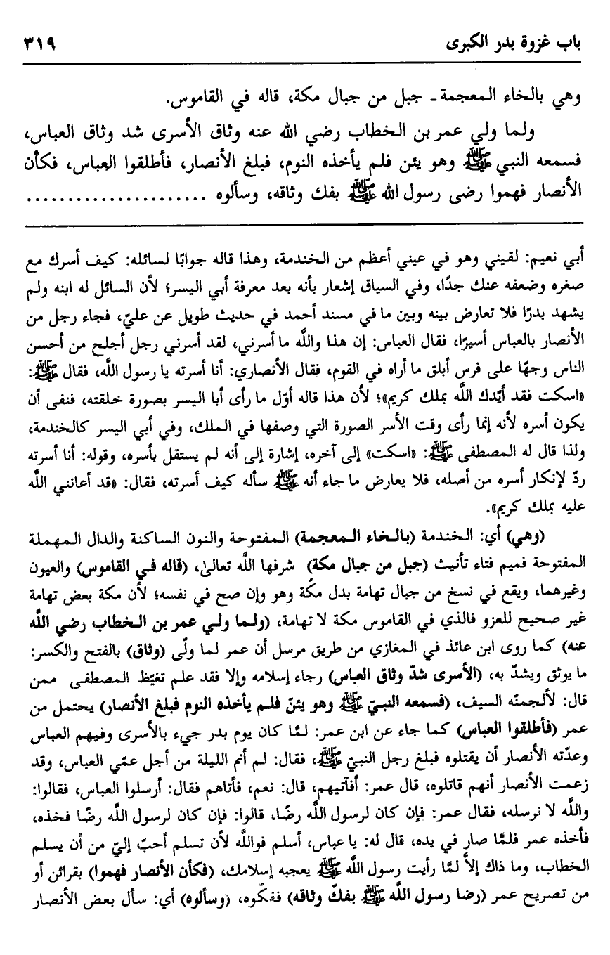 "وهي" أي: الخندمة "بالخاء المعجمة" المفتوحة والنون الساكنة والدال المهملة المفتوحة فميم فتاء تأنيث "جبل من جبال مكة" شرفها الله تعالى، "قاله في القاموس" والعيون وغيرهما، ويقع في نسخ من جبال تهامة بدل مكة وهو وإن صح في نفسه؛ لأن مكة بعض تهامة غير صحيح للعزو فالذي في القاموس مكة لا تهامة، "ولما ولي عمر بن الخطاب رضي الله عنه" كما روى ابن عائذ في المغازي من طريق مرسل أن عمر لما ولي "وثاق" بالفتح والكسر: ما يوثق ويشد به، "الأسري شد وثاق العباس" رجاء إسلامه وإلا فقد علم تغيظ المصطفى ممن قال: لألجمنه السيف، "فسمعه النبي صلى الله عليه وسلم وهو يئن فلم يأخذه النوم فبلغ الأنصار" يحتمل من عمر "فأطلقوا العباس" كما جاء عن ابن عمر: لما كان يوم بدر جيء بالأسرى وفيهم العباس وعدته الأنصار أن يقتلوه فبلغ رجل النبي صلى الله عليه وسلم، فقال: "لم أنم الليلة من أجل عمي العباس، وقد زعمت الأنصار أنهم قاتلوه"، قال عمر: أفآتيهم، قال: "نعم"، فأتاهم فقال: أرسلوا العباس، فقالوا: والله لا نرسله، فقال عمر: فإن كان لرسول الله رضا، قالوا: فإن كان لرسول الله رضا فخذه، فأخذه عمر فلما صار في يده، قال له: يا عباس، أسلم فوالله لأن تسلم أحب إلي من أن يسلم الخطاب، وما ذاك إلا لما رأيت رسول الله صلى الله عليه وسلم يعجبه إسلامك، "فكأن الأنصار فهموا" بقرائن أو من تصريح عمر "رضا رسول الله صلى الله عليه وسلم بفك وثاقه" ففكوه، "وسألوه" أي: سأل بعض الأنصار