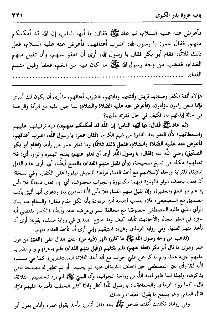 فأعرض عنه عليه السلام، ثم عاد صلى الله عليه وسلم فقال: "يا أيها الناس، إن الله قد أمكنكم منهم". فقال عمر: يا رسول الله، اضرب أعناقهم، فأعرض عنه عليه السلام، فعل ذلك ثلاثا، فقام أبو بكر فقال: يا رسول الله، أرى أن تعفو عنهم، وأن تقبل منهم الفداء، فذهب من وجه رسول الله صلى الله عليه وسلم ما كان فيه من الغم، فعفا وقبل منهم الفداء...........................................................